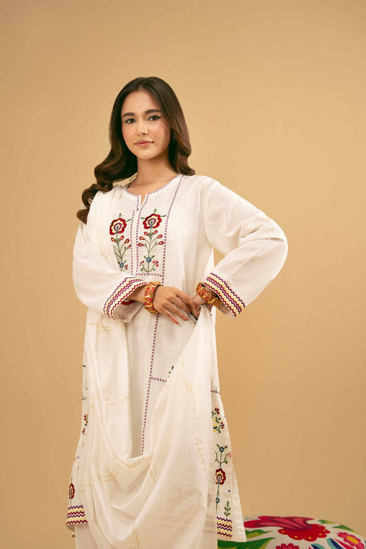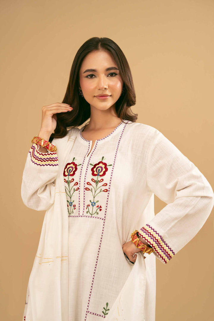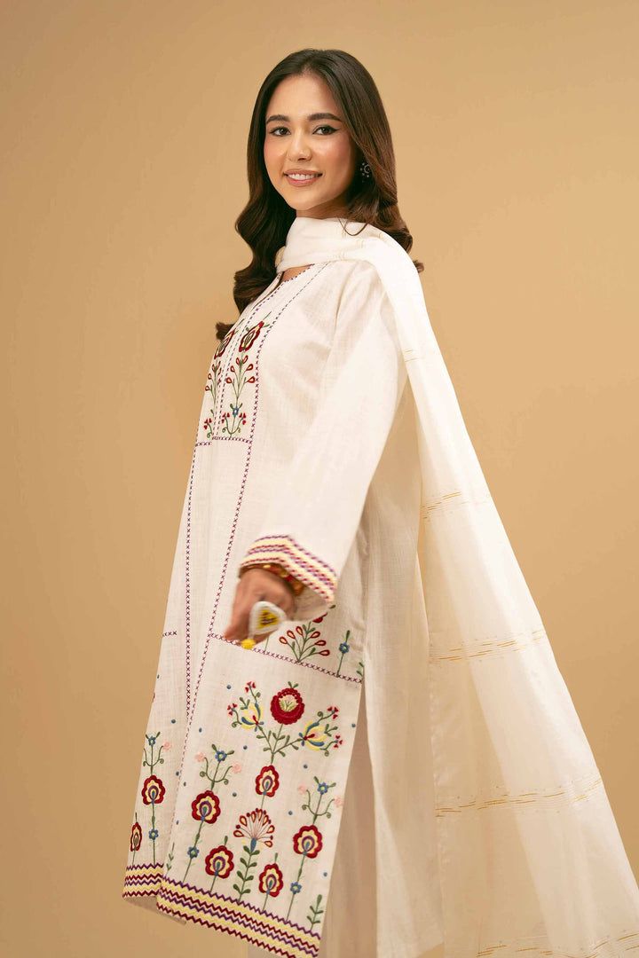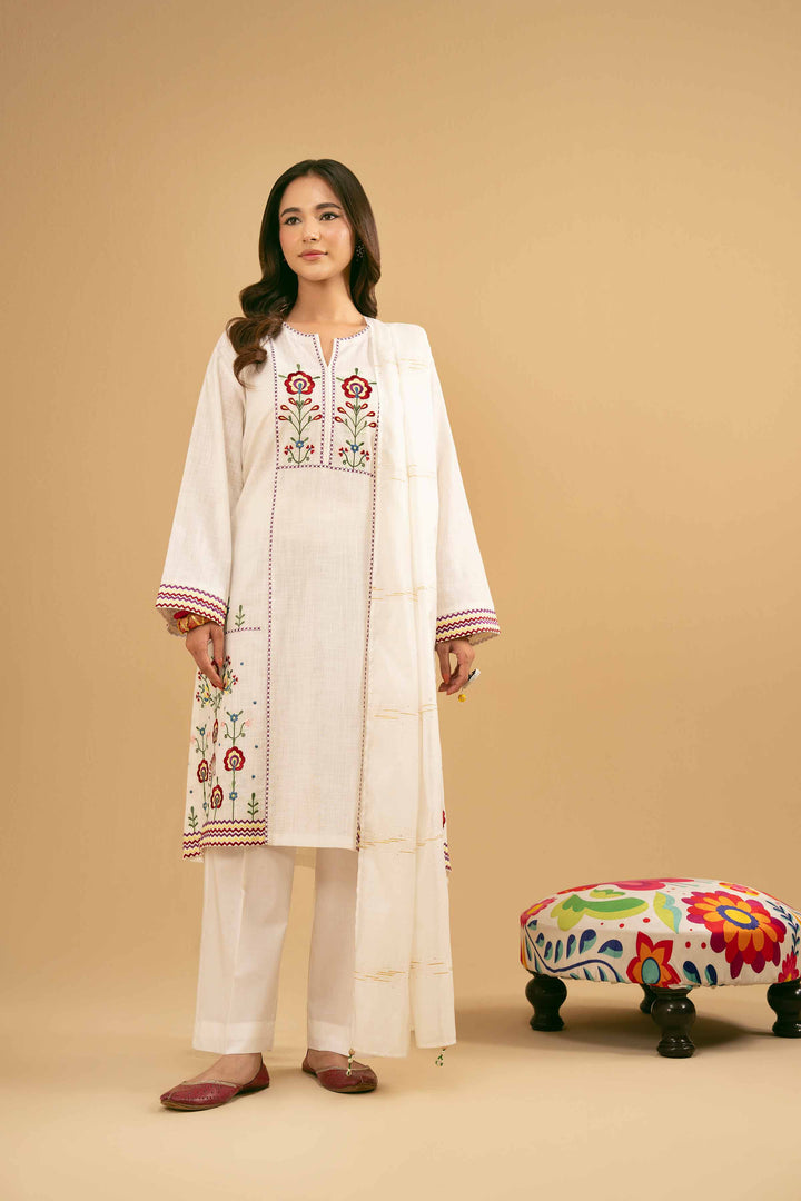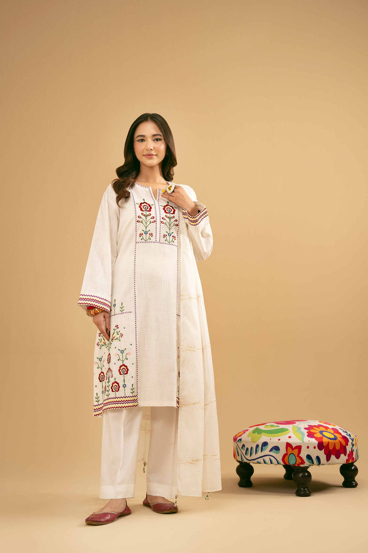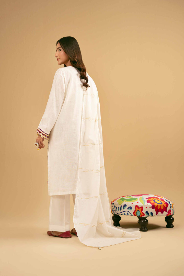 Enhance your wardrobe with this embroidered three-piece suit from the latest Pret Summer Collection, a perfect blend of timeless elegance, intricate detailing, and seasonal comfort.