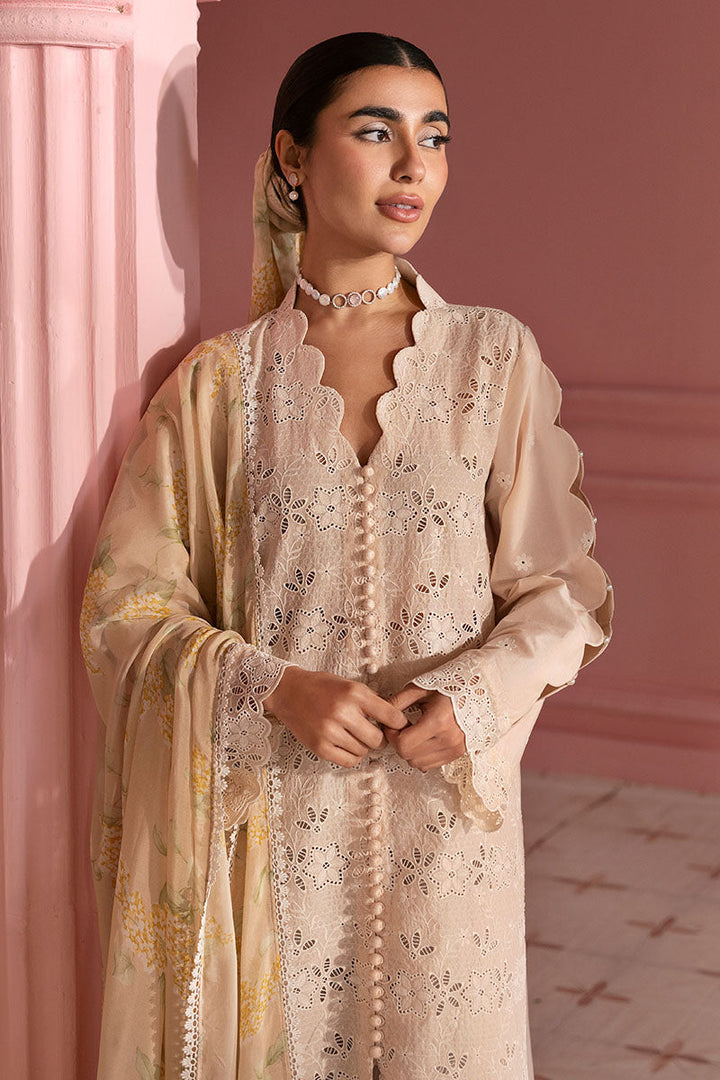 Expertly crafted with lawn chikankari embroidery on the front and sleeves, this PEACH PARFAIT-3PC PRINTED LAWN SUIT adds a touch of elegance to any wardrobe. The dyed back and cambric trouser with 60" schiffli patti offer both style and comfort. Complete the look with the luxurious silk printed dupatta.