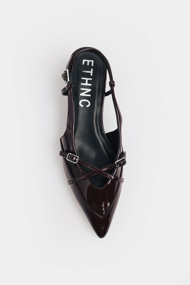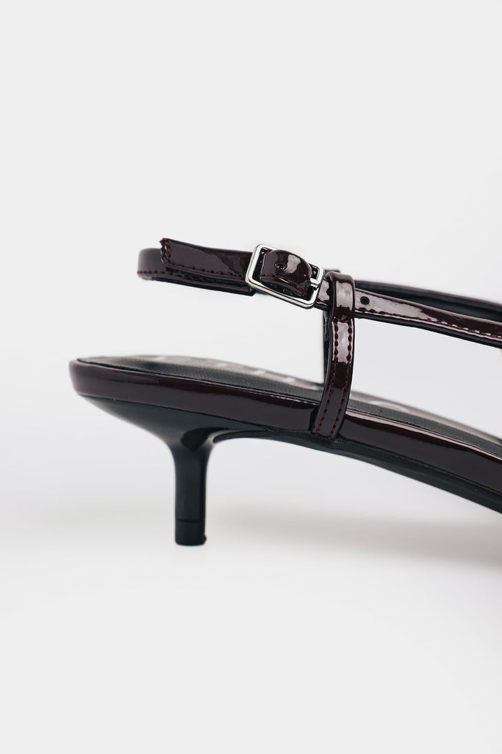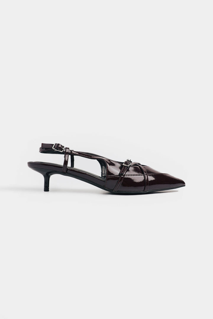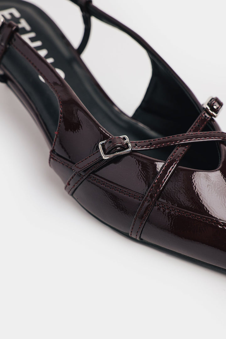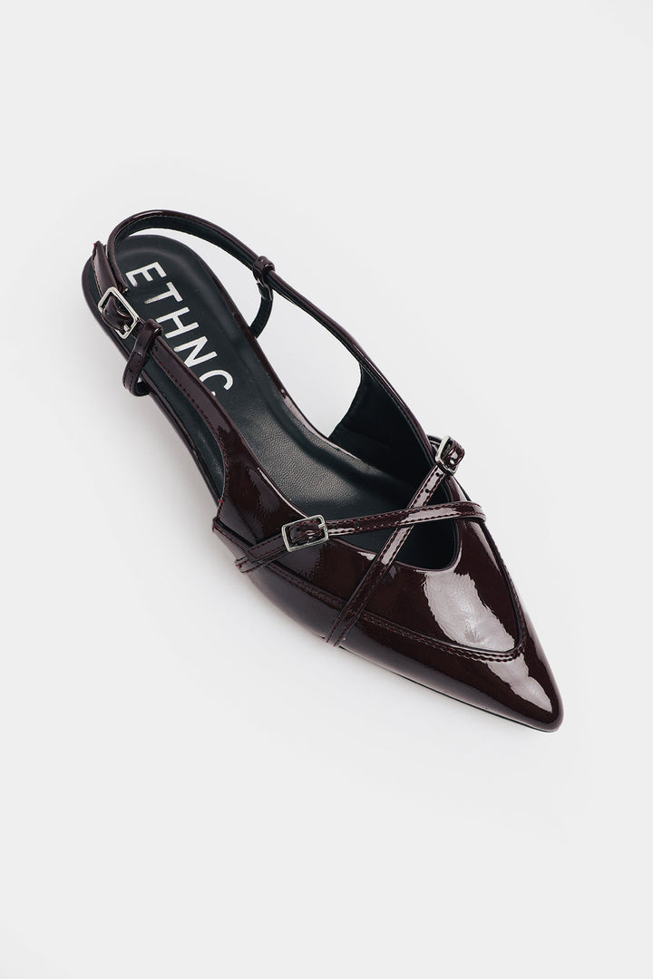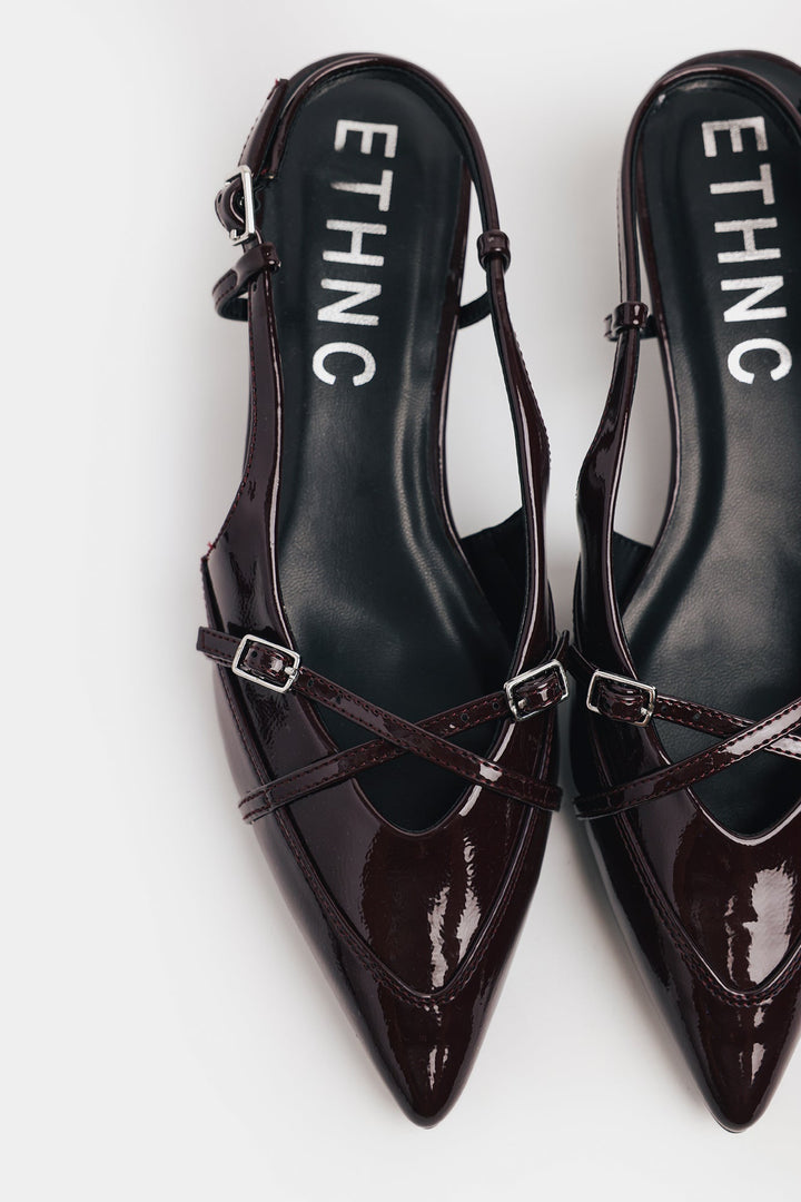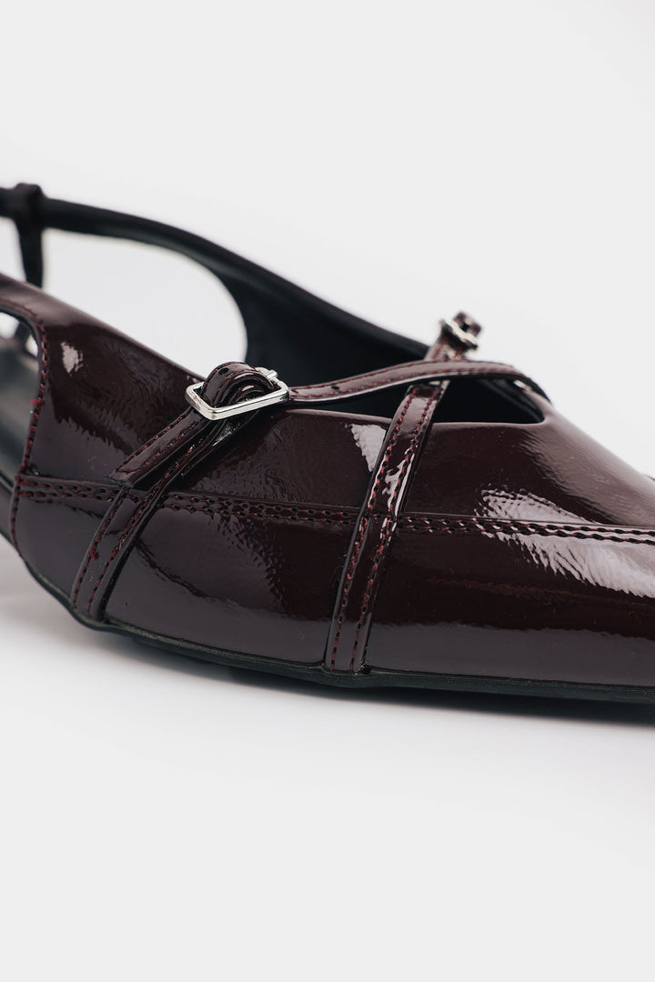 Step out in modern sophistication with these stunning slingback heels. Crafted in a deep, captivating maroon color, the glossy patent finish offers a luxurious shine that catches the light. The design is elevated by a chic pointed toe and an edgy arrangement of multiple thin straps across the front, secured with small silver-toned buckles. A slender kitten heel provides the perfect height for comfortable all-day wear. These structured heels are the ideal statement piece for transitioning from office hours to evening events.