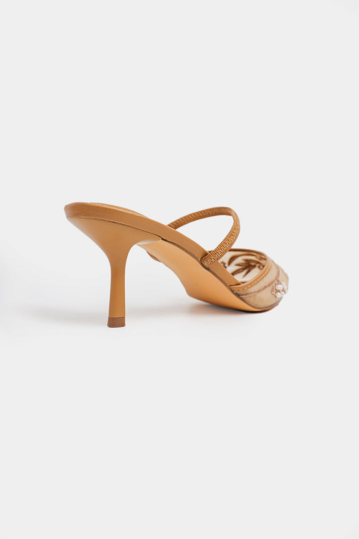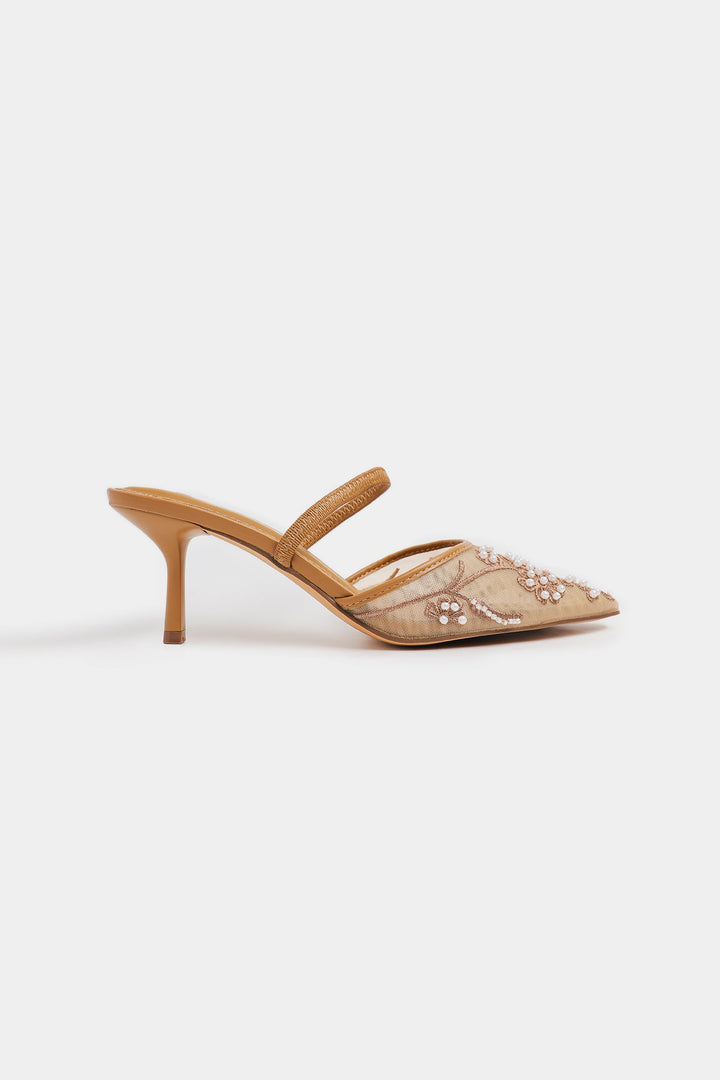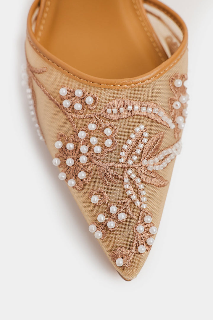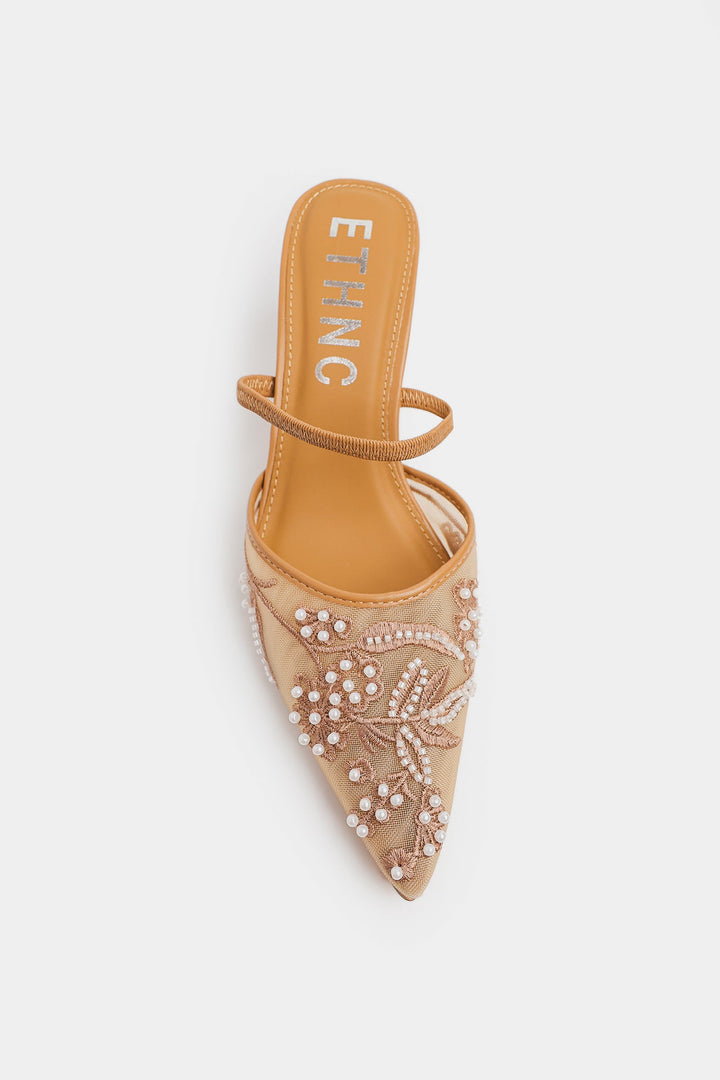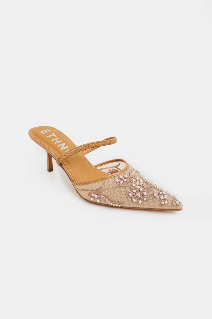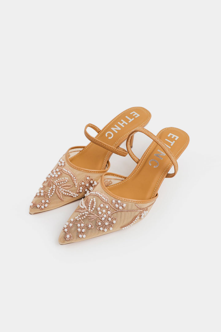 A pointed toe heels with intricate hand-embellished bead and sequin work in floral and swirling patterns, and richly adorned with shimmering embellishments in soft pink and champagne tones. Festive, glamorous, and perfect for weddings, parties, or traditional outfits.