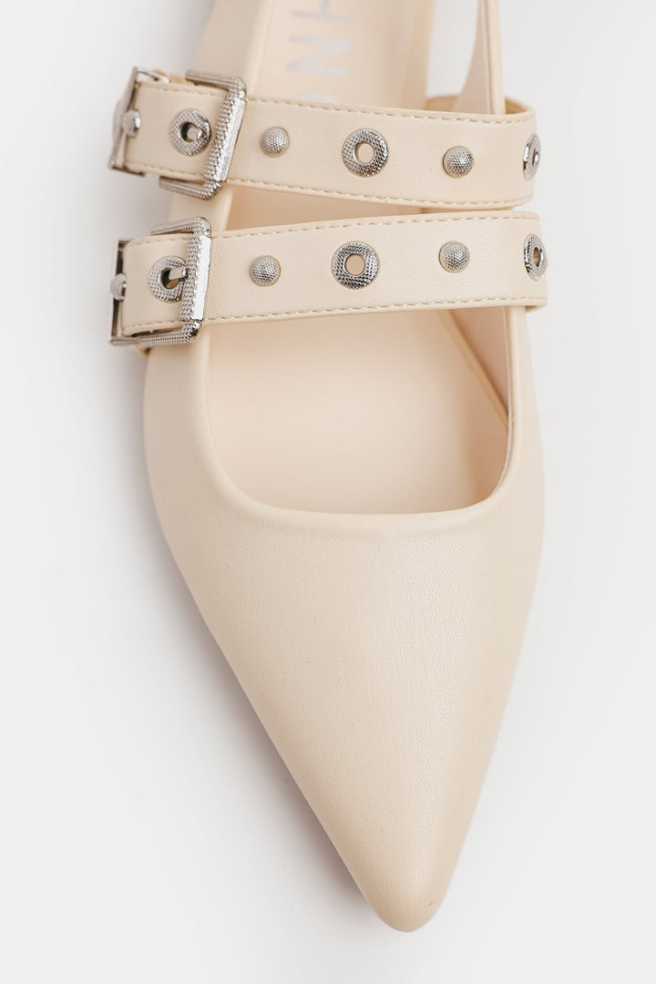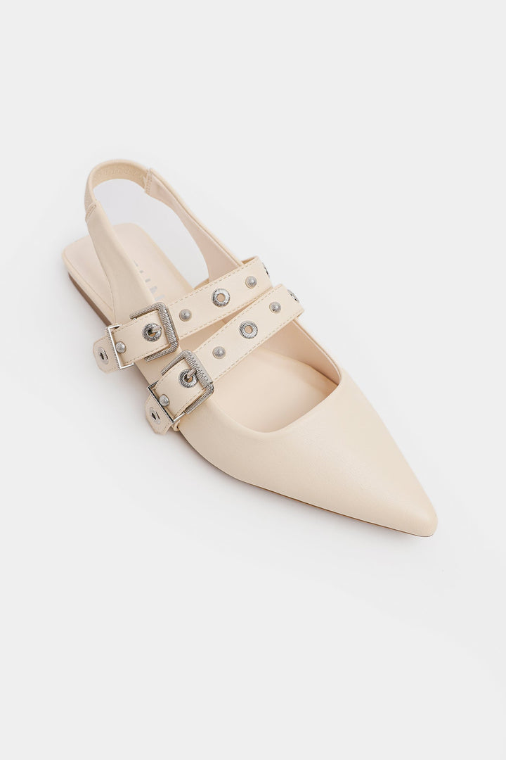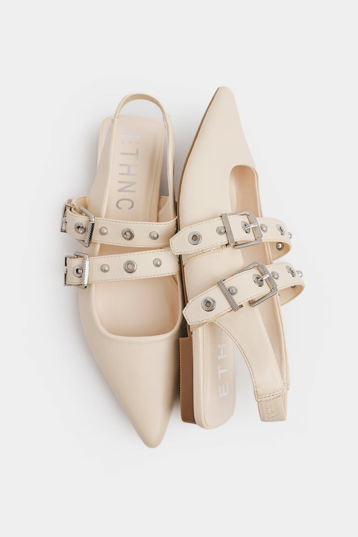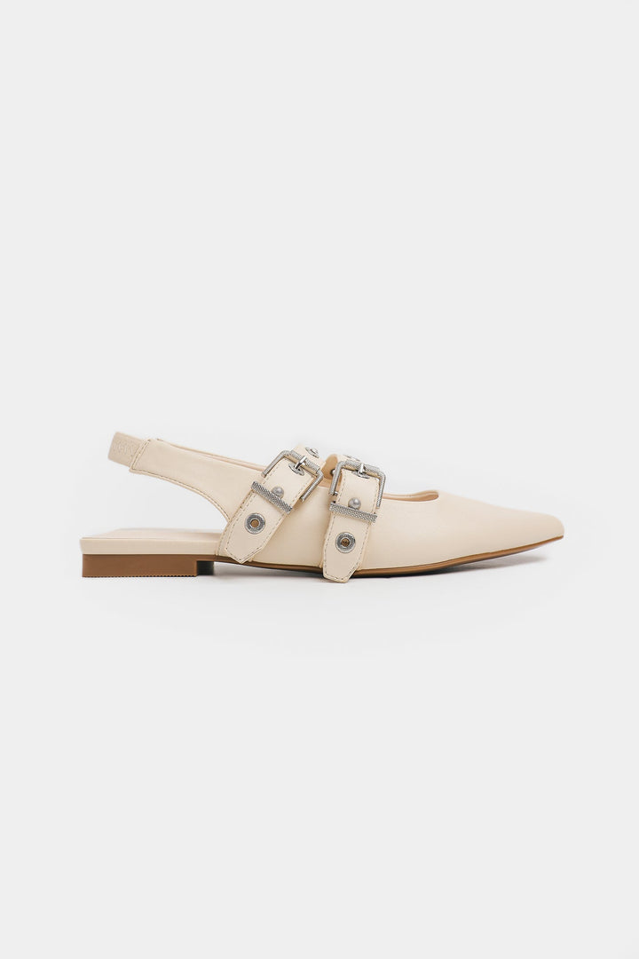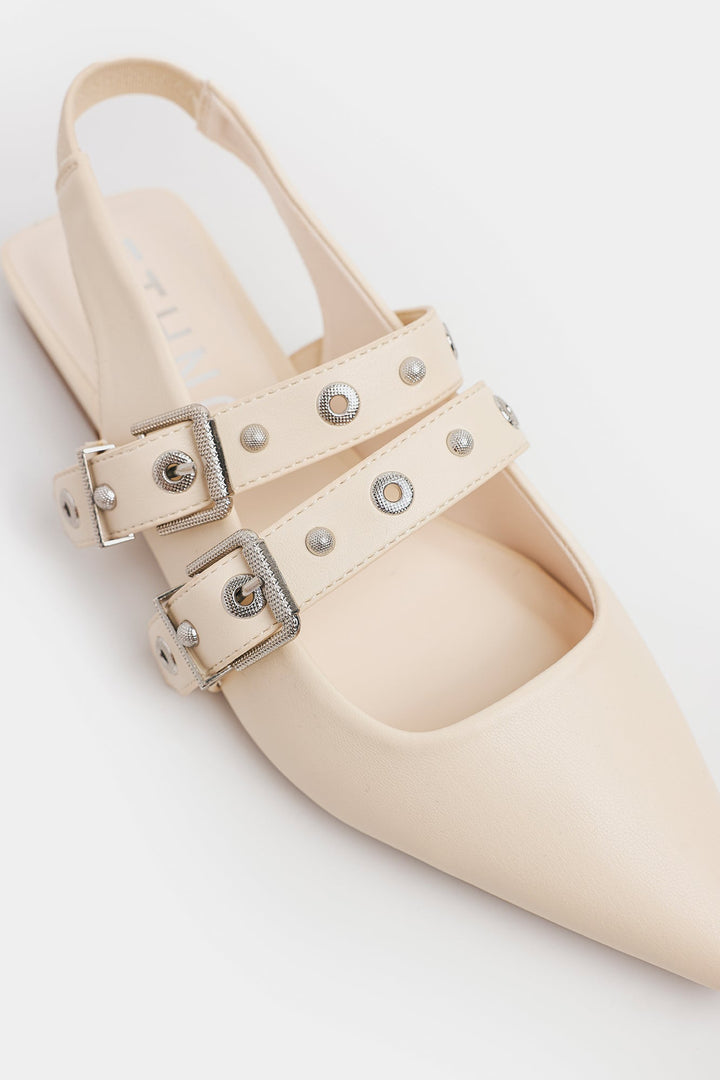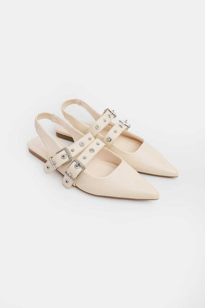 Inject an edge into your everyday style with these striking pointed slingback flats. Crafted in a soft, versatile creamy beige hue, the shoe’s refined silhouette is given a modern, rebellious twist. The design features two prominent straps across the vamp, fully adorned with bold silver-toned buckles and eyelets. This contrast between the delicate, neutral color and the punk-inspired hardware creates a truly captivating look. Finished with a secure slingback strap and a comfortable flat sole, these shoes blend effortless comfort with undeniable street style.