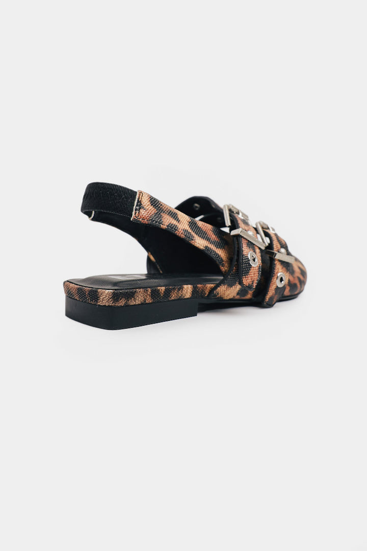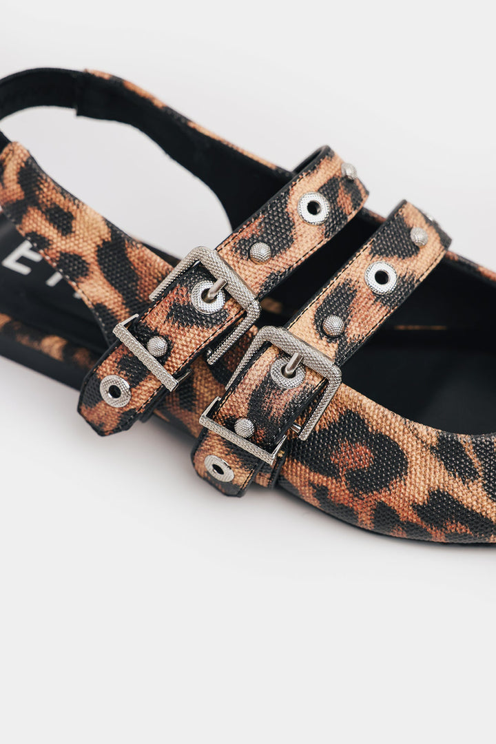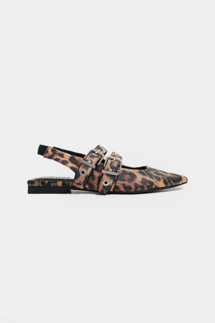 Inject an edge into your everyday style with these striking pointed slingback flats. Crafted in multi hue, the shoe’s refined silhouette is given a modern, rebellious twist. The design features two prominent straps across the vamp, fully adorned with bold silver-toned buckles and eyelets. This contrast between the delicate, neutral color and the punk-inspired hardware creates a truly captivating look. Finished with a secure slingback strap and a comfortable flat sole, these shoes blend effortless comfort with undeniable street style.