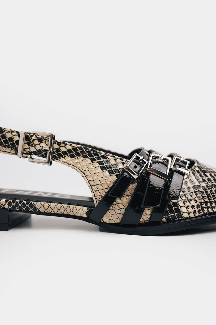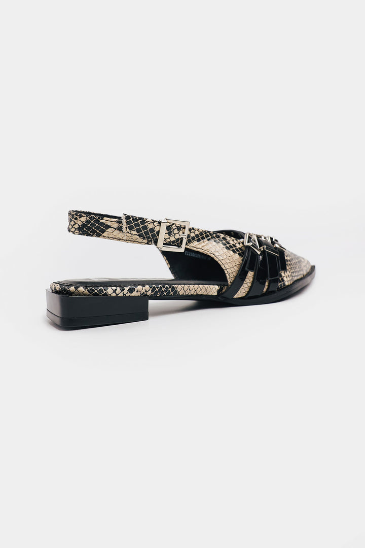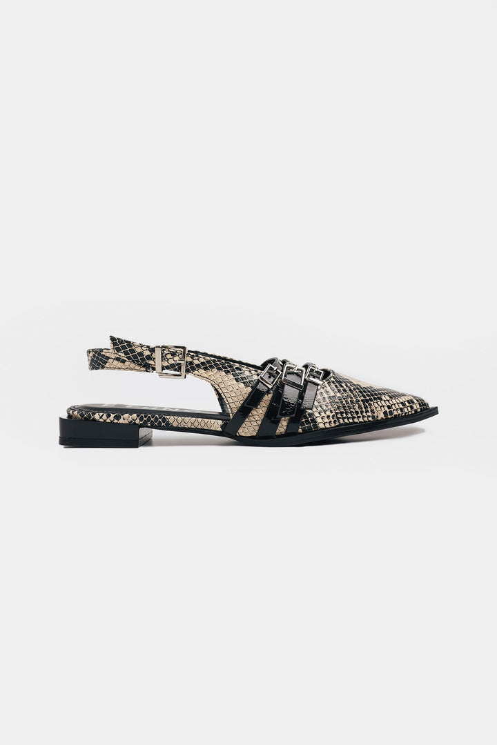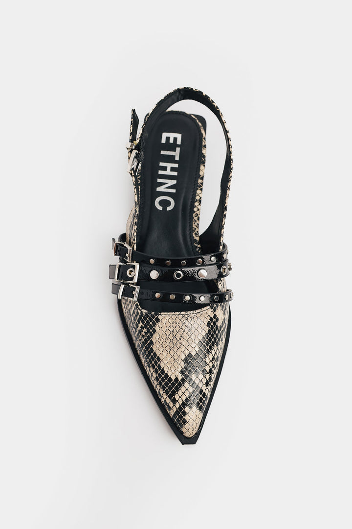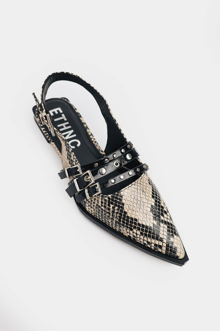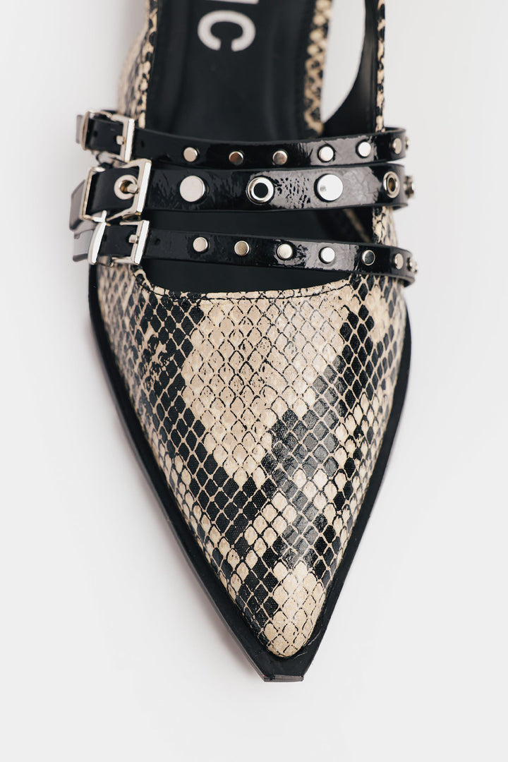 Step out in style with these bold pointed slingback flats. Crafted in multi hue, these shoes merge classic elegance with street edge. The sharp pointed toe is contrasted by multiple thin straps across the vamp, which is heavily detailed with silver-toned studs and eyelets. An adjustable buckle strap adds to the edgy aesthetic, while the comfortable slingback ensures a secure fit. These flats are the perfect statement piece to add polish and punk-rock attitude to any outfit.