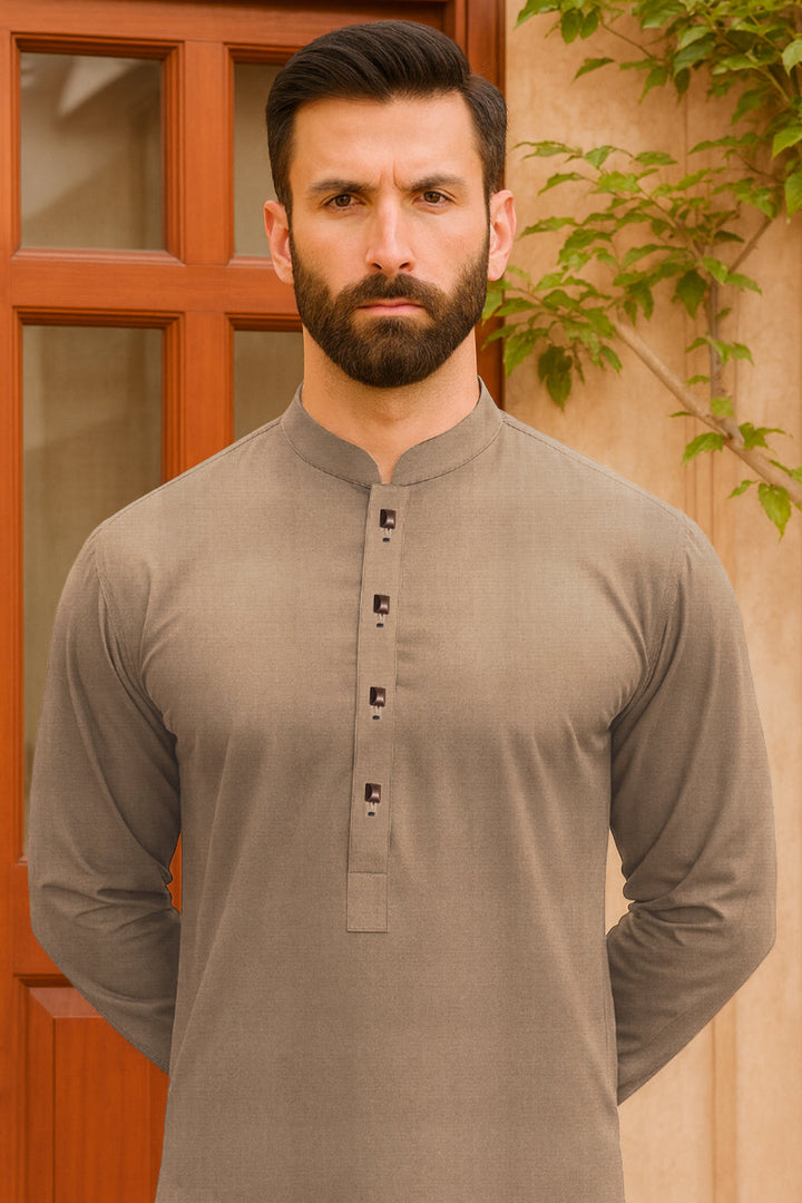 Elevate Your Wardrobe With SAYA’s Premium Blended Wear Stitched Suit. Crafted From Super Soft Blended Wash-N-Wear Fabric In Light Brown, The Ensemble Features A Ready-To-Wear Solid Shirt Paired With Matching Stitched Trousers. Lightweight And Effortlessly Elegant, It Merges Comfort With Polished Utility—Ideal For Formal Occasions, Festive Celebrations, Or Smart Everyday Refinement.