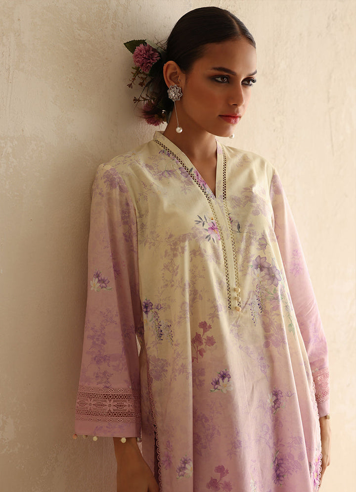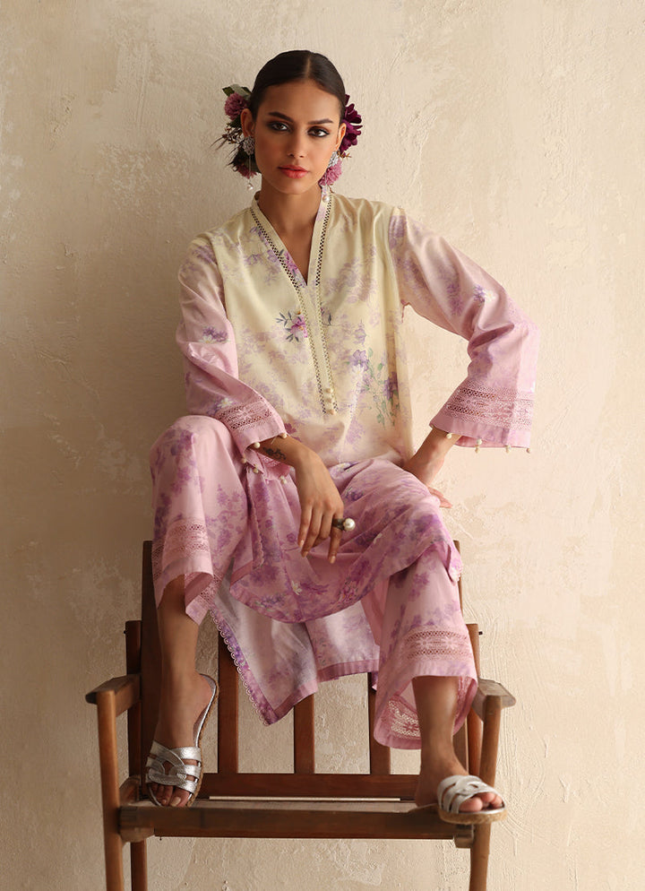 The Blush Lilac Floral Co-Ord Set from our Selene 2024 collection. A two piece set featuring a V-neckline with lace & pearl embellishment, sleeves with lace embellishments paired with matching culottes.