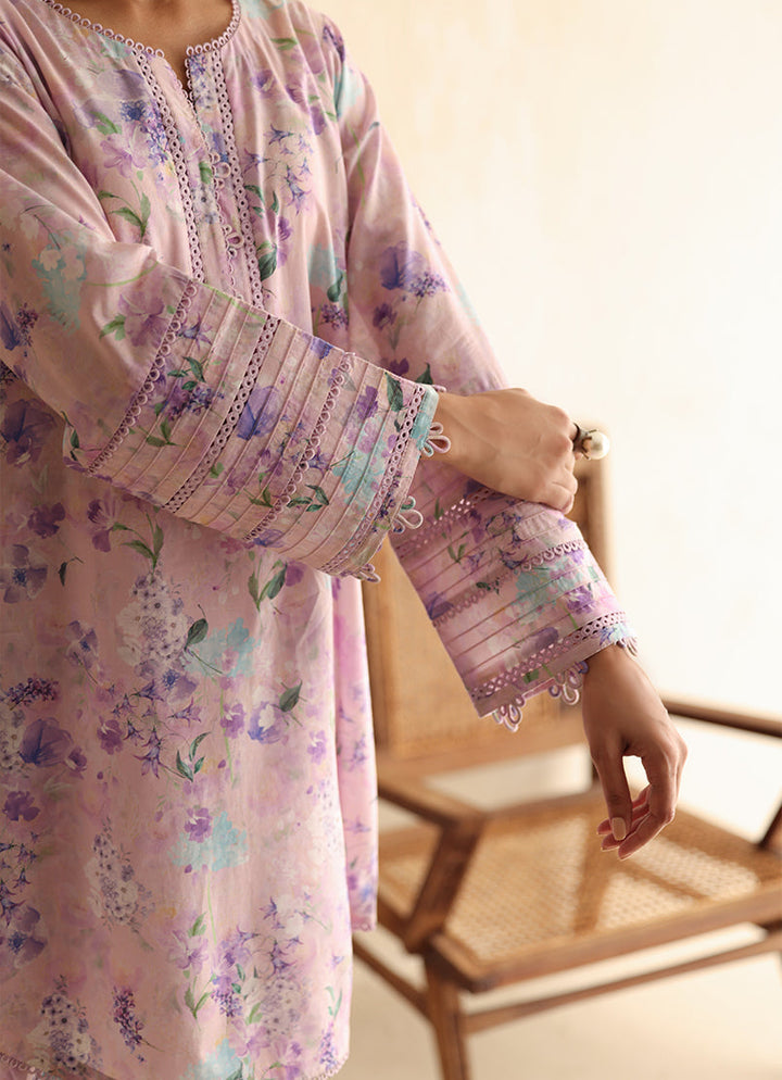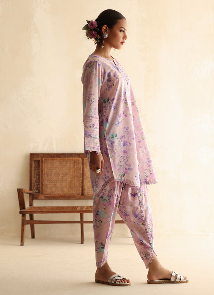 The Pink Floral Co-Ord Set from our Selene 2024 collection. Shirt features a round neckline with slit, lace embellishments on neckline, sleeves and hemline, paired with matching tulip shalwar.