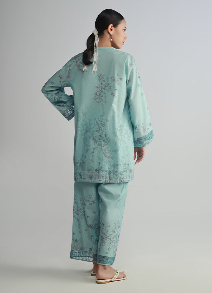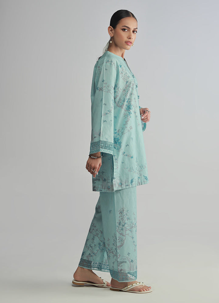 The Sky Blue Floral Printed Co-Ord Set from our Legends of Fall '24 Collection. A straight silhouette, round neckline with slit finished with buttons, full length sleeves with lace embellishment paired with breezy culottes.