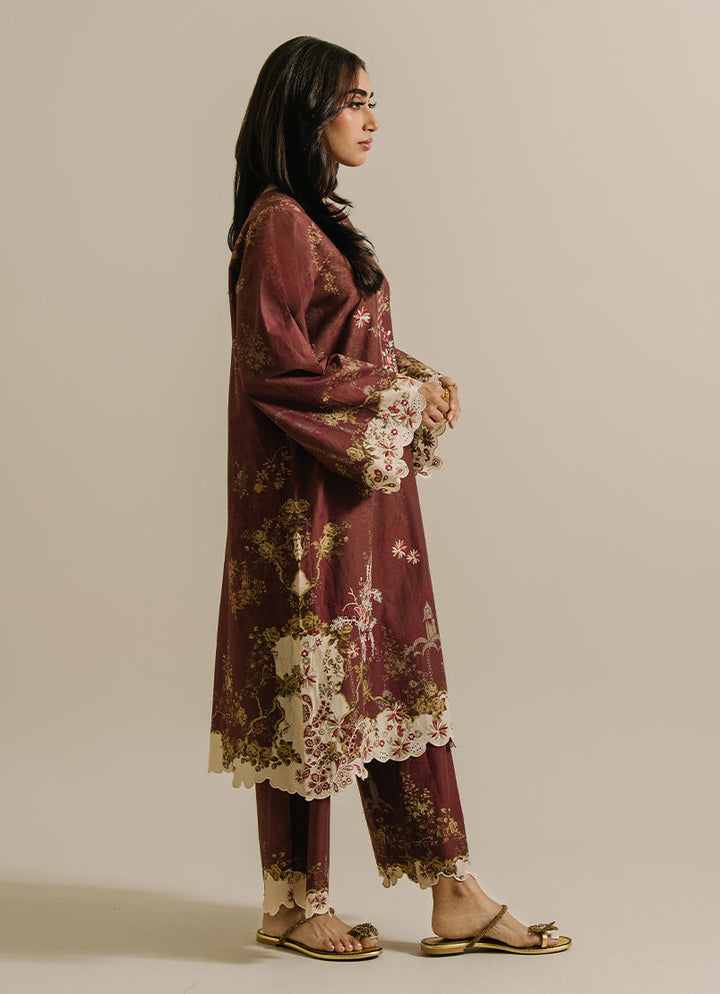 The Deep Maroon Cotton Embroidered Co-ord Set from our IM Print category features round neckline & full-length bell sleeves paired with embroidered trousers.