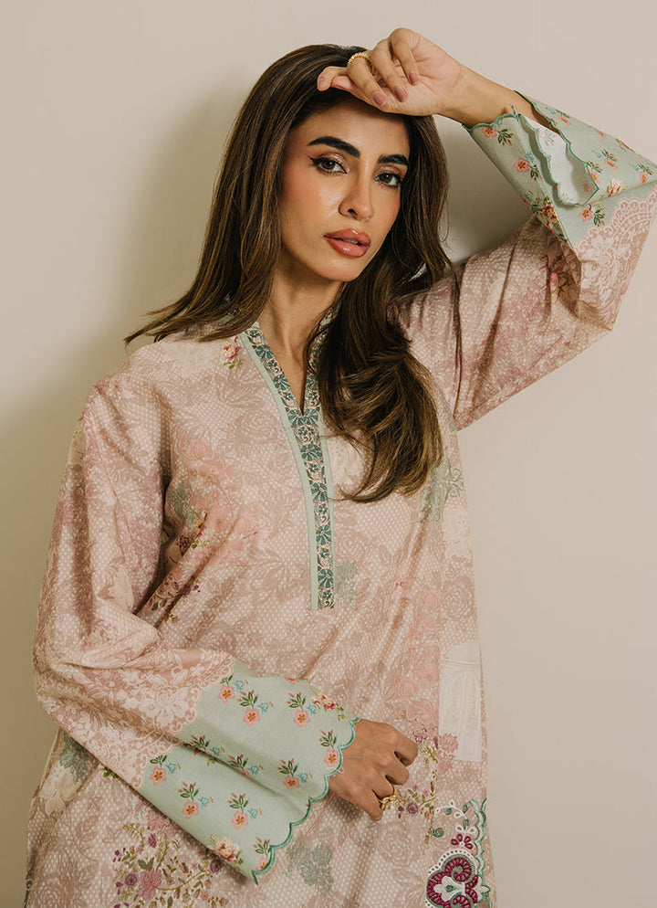 The Beige Cotton Embroidered Co-ord Set from our IM Print category features band collar & full-length bell sleeves paired with straight trousers.