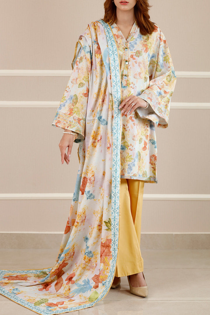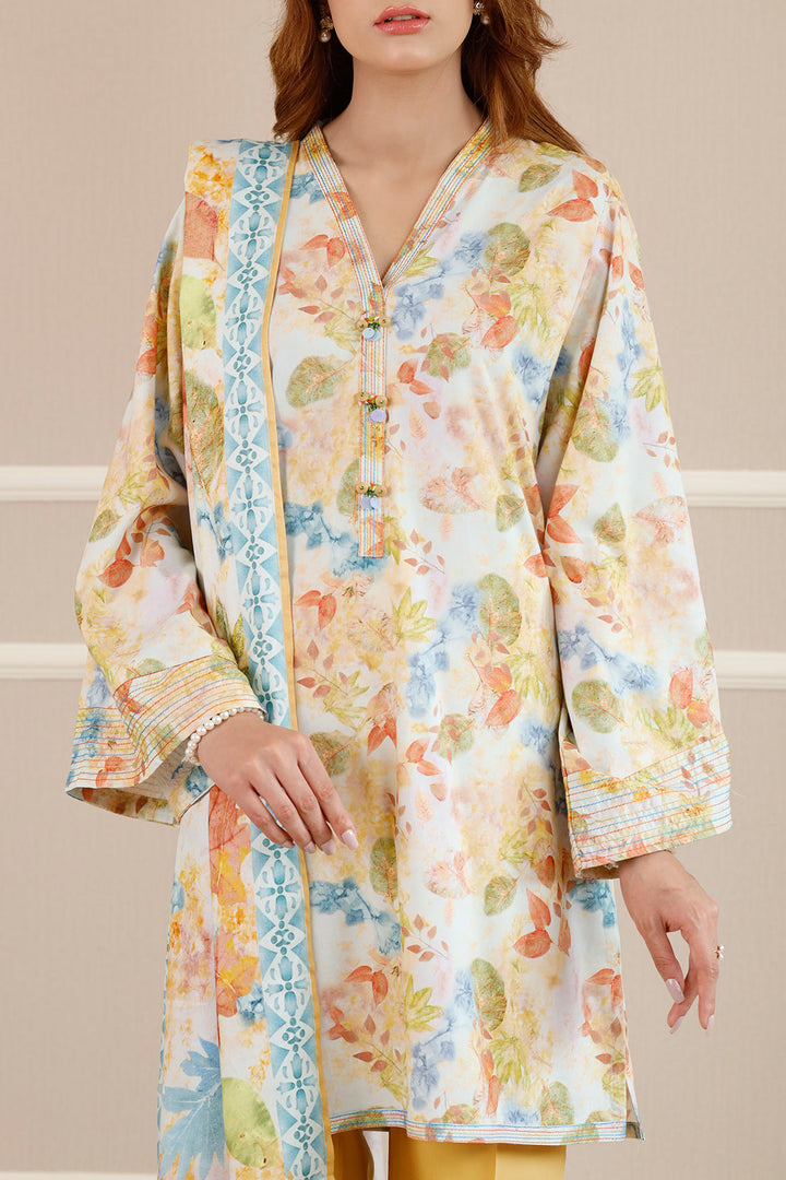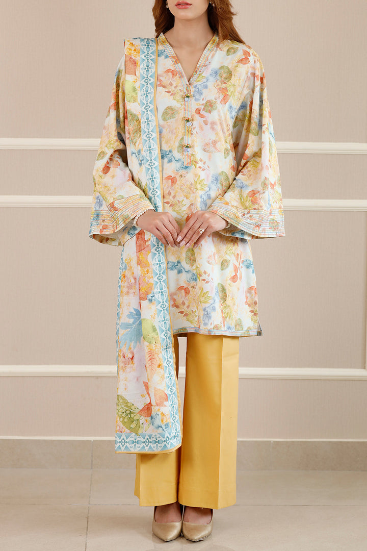Introducing Saya's Printed Embroidered Cotton Viscose Stitched 3-Piece ensemble, a harmonious blend of comfort and sophistication. This ready-to-wear set features an intricately embroidered yellow shirt, dyed trousers, and a coordinating winter cotton dupatta, all crafted from premium cotton viscose fabric. The breathable material ensures all-day comfort, making it an excellent choice for both casual and formal occasions.