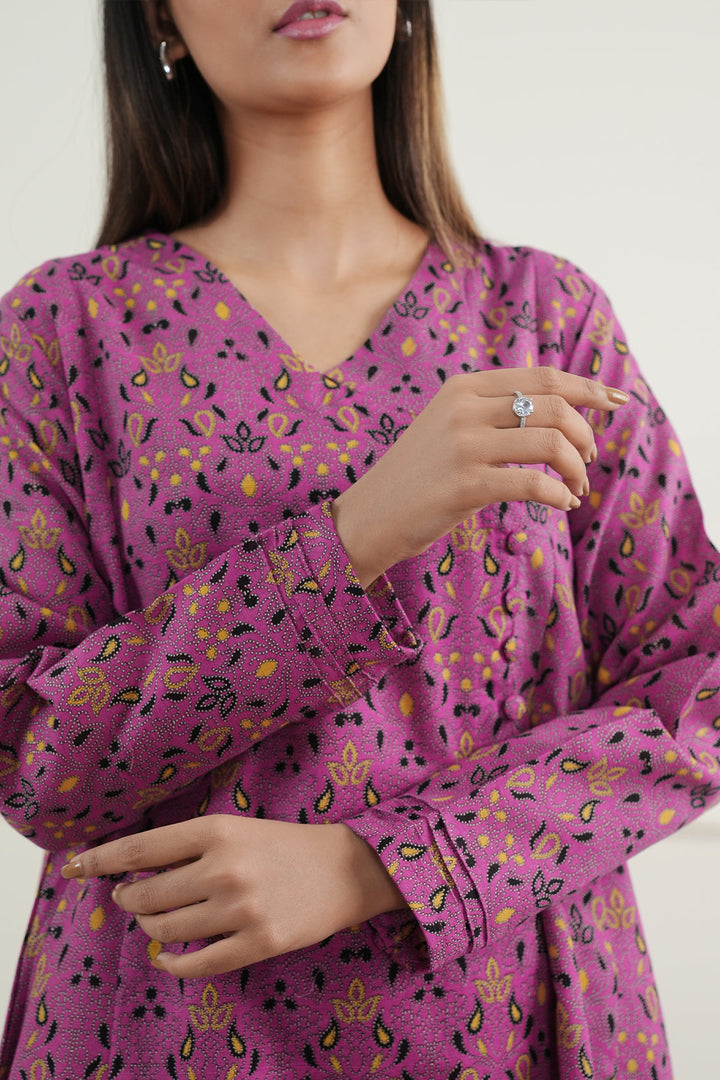 Saya's Printed Khaddar Stitched 2-Piece Set (Design: SP-9381) in a vibrant fuchsia hue offers both warmth and style for your winter wardrobe. Crafted from premium khaddar fabric, this ready-to-wear ensemble includes a beautifully printed shirt and matching trousers, ensuring comfort and elegance for casual outings or family gatherings.