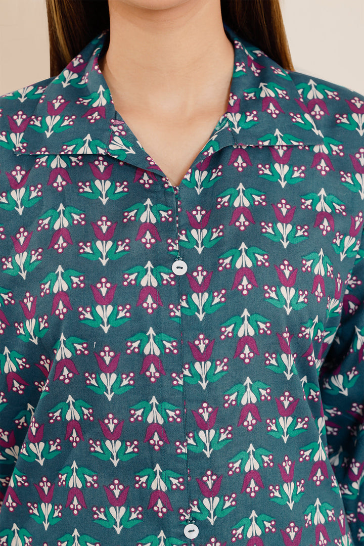 Introducing Saya's Printed Cotton Viscose Stitched 2-Piece ensemble, a harmonious blend of comfort and style for your wardrobe. This ready-to-wear set features a blue cotton-viscose shirt adorned with intricate prints, complemented by matching trousers, making it an ideal choice for both casual and semi-formal occasions.