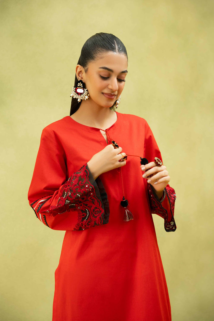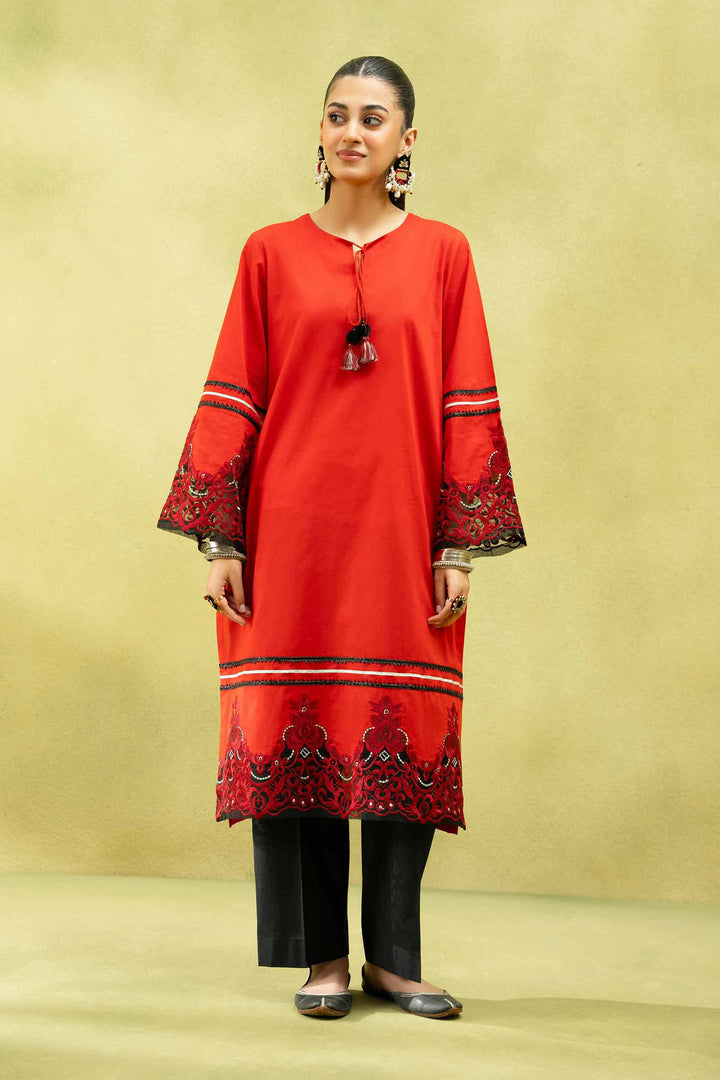 Round Neckline With Tassels Detail, Embroidered Front Hem & Sleeves With Lace Insertion, Long Shirt