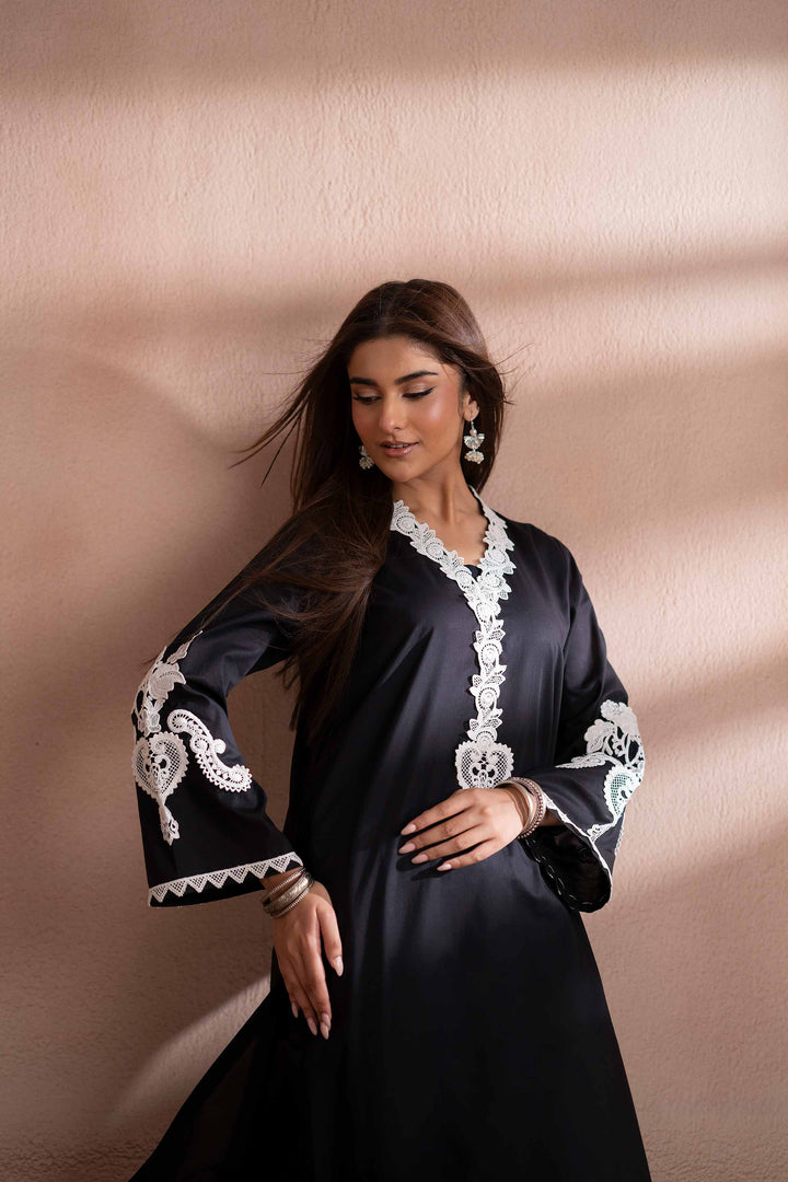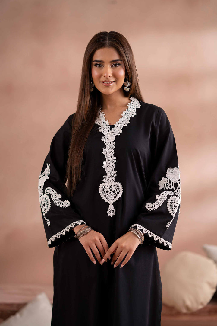 Straight long shirt with a V-neckline, enhanced with lace patch detailing.