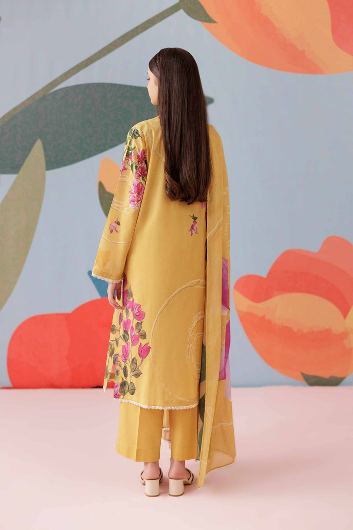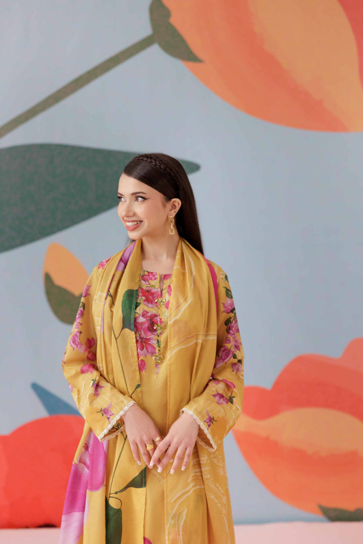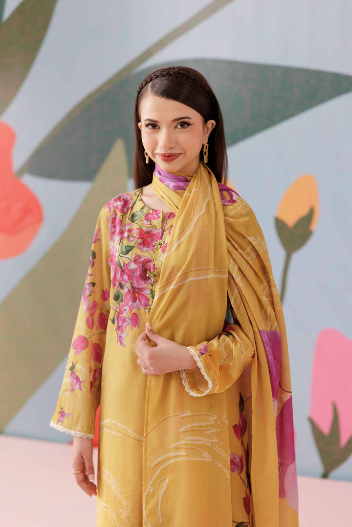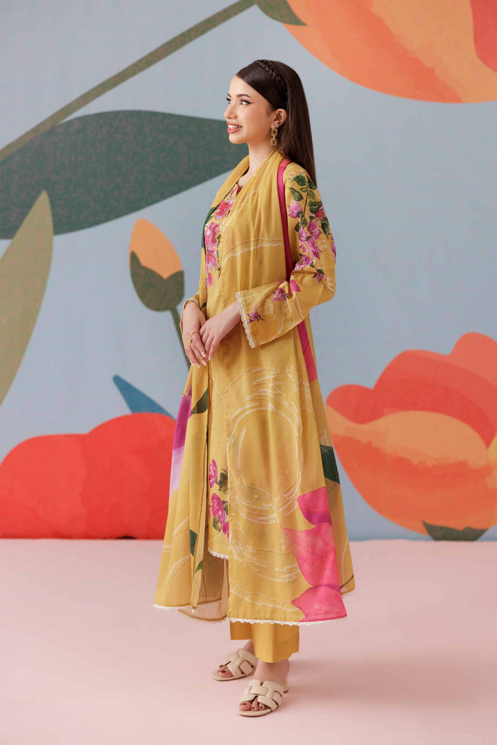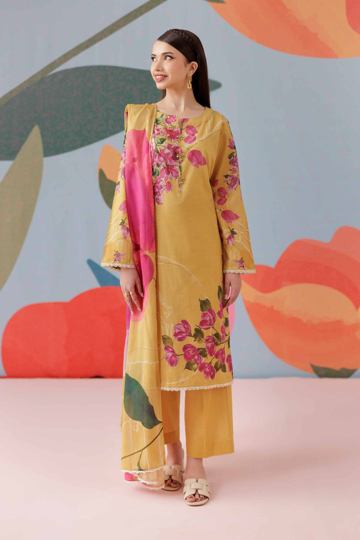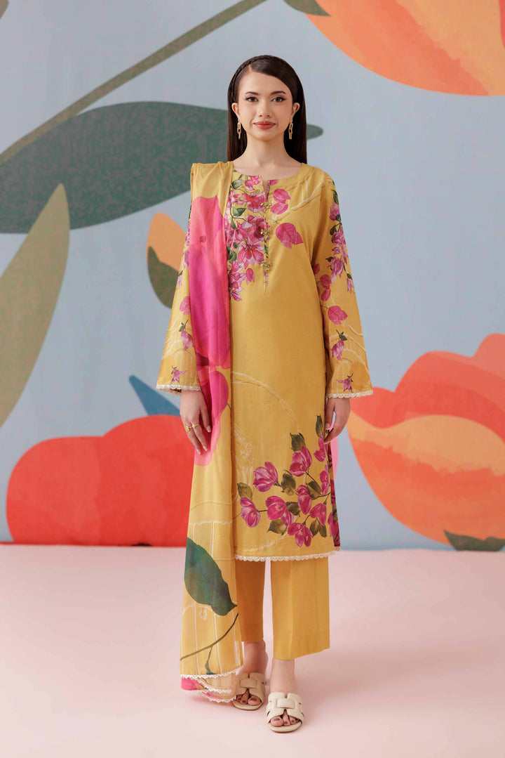Complete your look with this printed three-piece suit from the latest Pret Summer Collection, crafted to add depth, elegance, and seasonal charm to your wardrobe.