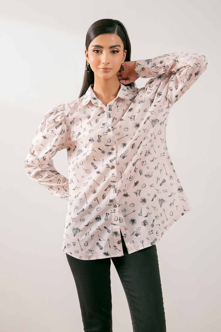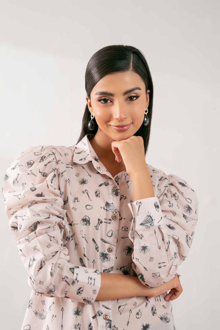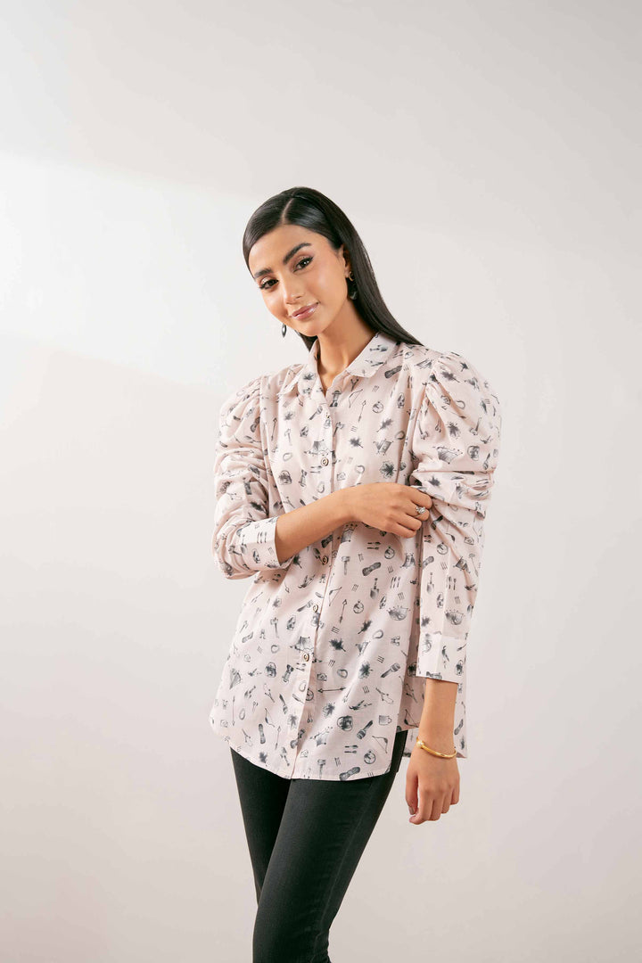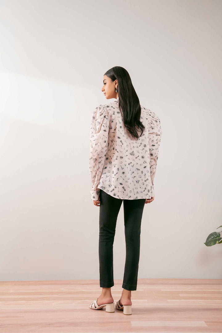 Collar neckline paired with puff sleeves in a chic button-down tunic.