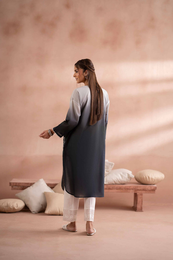 Elegant Long Embroidered Shirt with a Round Hem, Featuring a Round Neckline with Slit and Piping, Accentuated with Delicate Lace Detailing on the Hem and Sleeves.