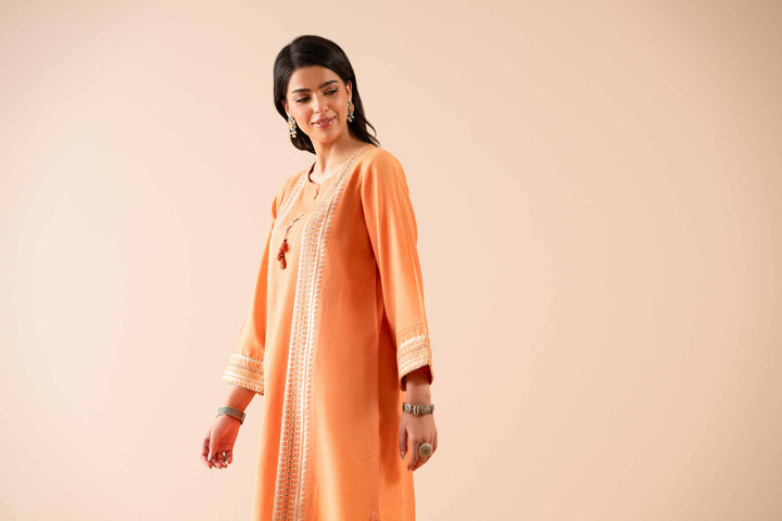 Round Neckline With Slit & Tassels Detail On Piping, Embroidered Front & Sleeves, Long Paneled Shirt