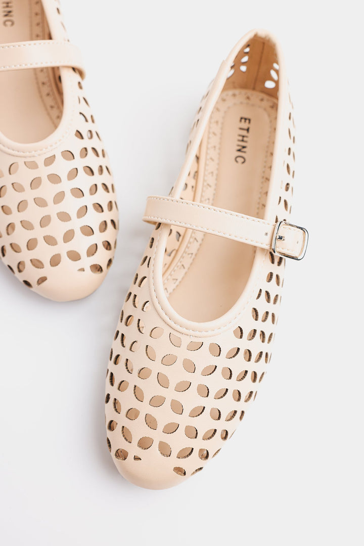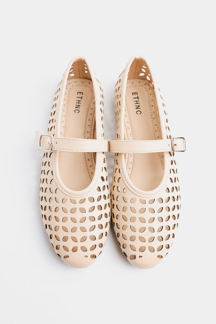 This is a stylish flat shoe in a soft off white color. It features a breathable, laser-cut perforated design throughout the upper, creating an airy and lightweight look. The shoe includes a thin strap for a secure fit, perfect for casual wear while maintaining comfort and flexibility.