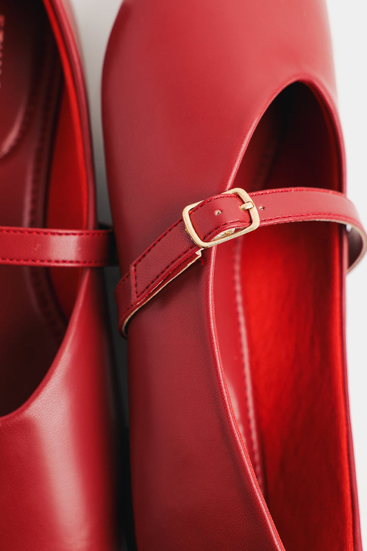 Add a classic touch to your look with these timeless red Mary Jane flats. The rich, ruby-red finish and graceful rounded toe offer a sophisticated silhouette. Featuring a delicate strap with a subtle gold-toned buckle, these shoes provide both a secure fit and an element of refined charm. Perfect for adding a pop of color to any outfit, they combine elegance and comfort for all-day wear.