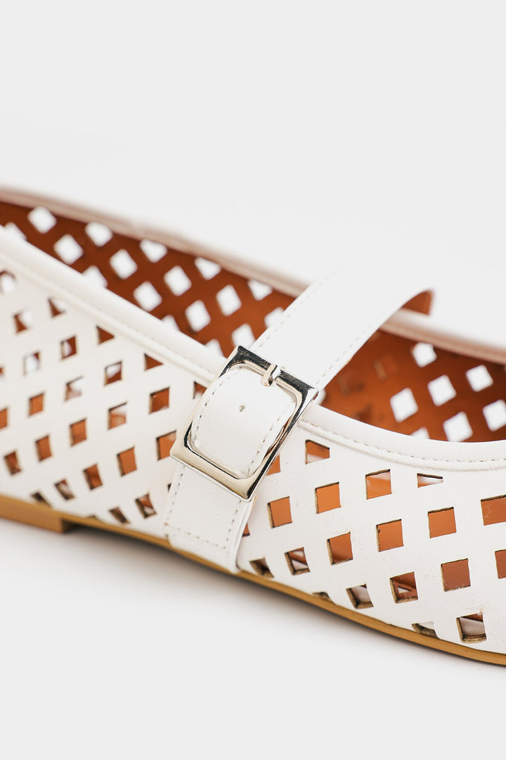 These pumps feature a lattice-like cutout design throughout, giving them a breathable and airy look, perfect for warmer weather. They have a rounded toe and a single strap across the top secured with a buckle, adding a touch of vintage charm. These flats are both fashionable and functional, suitable for casual or semi-dressy outfits.