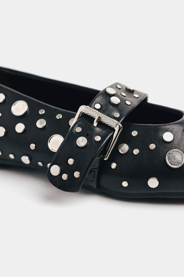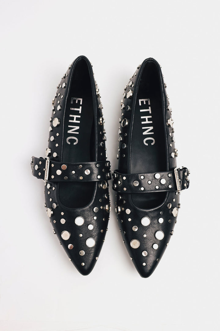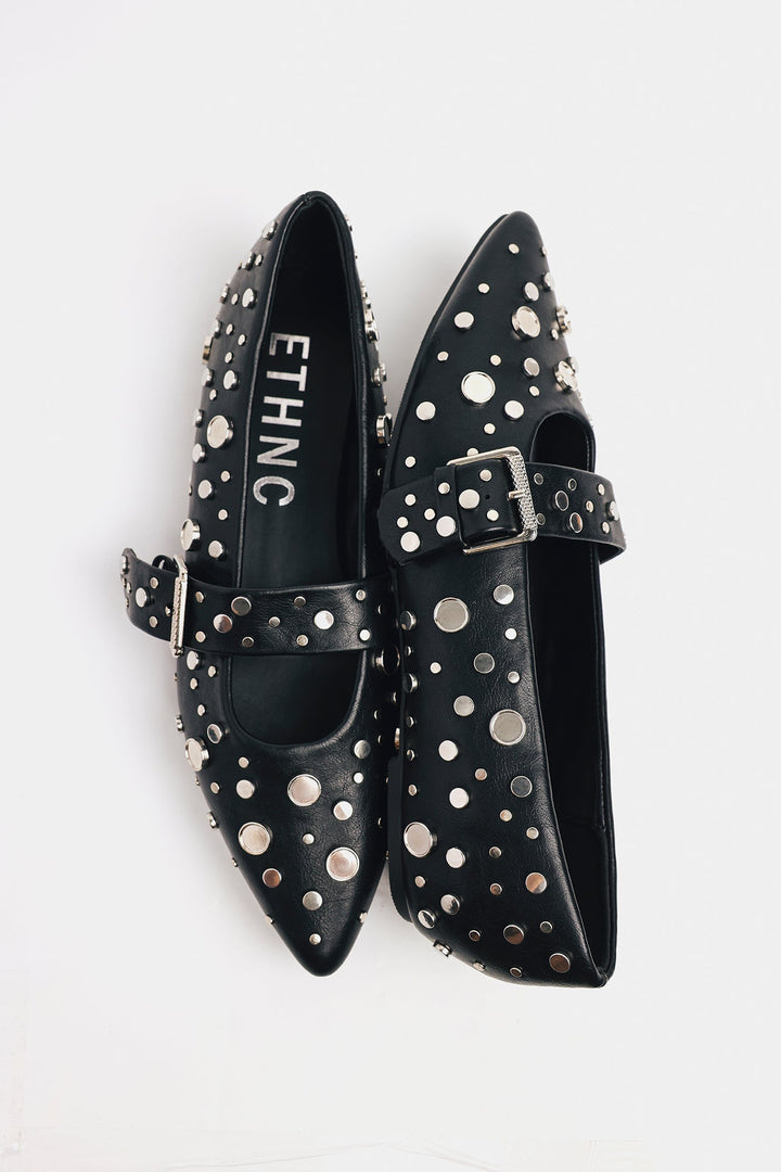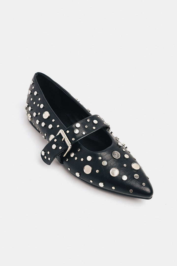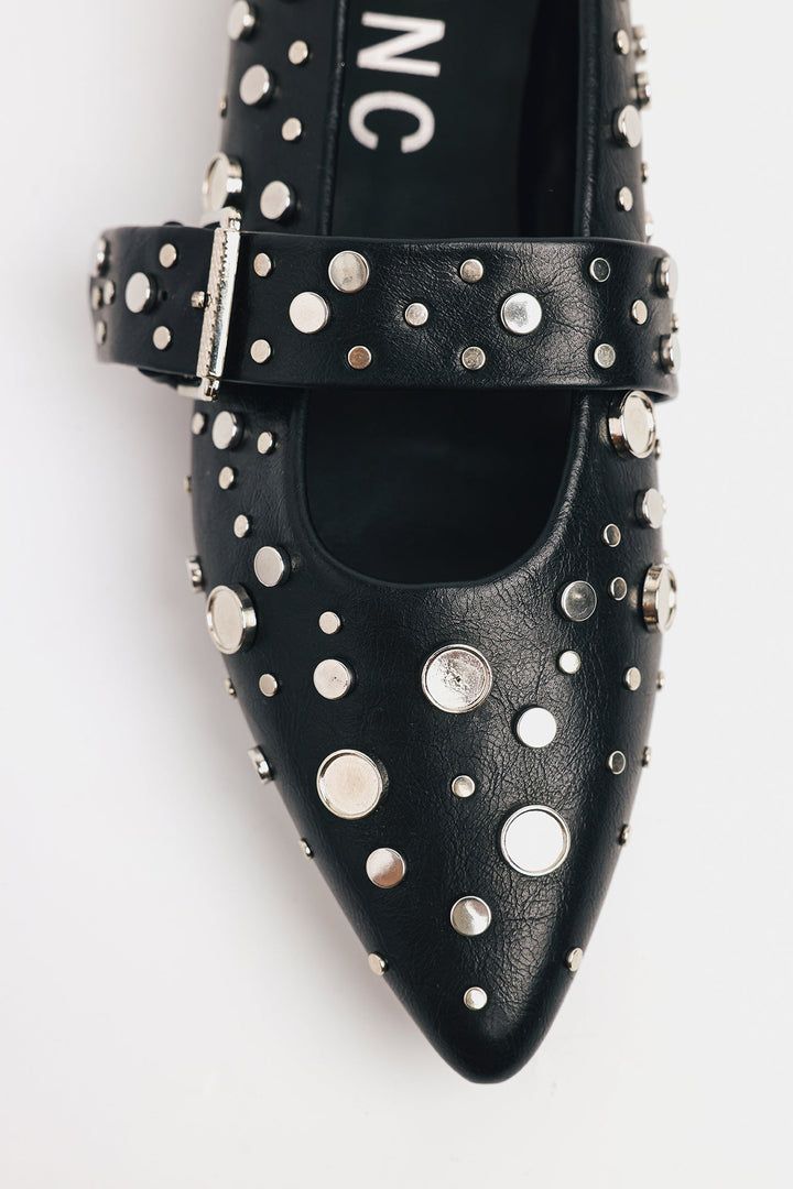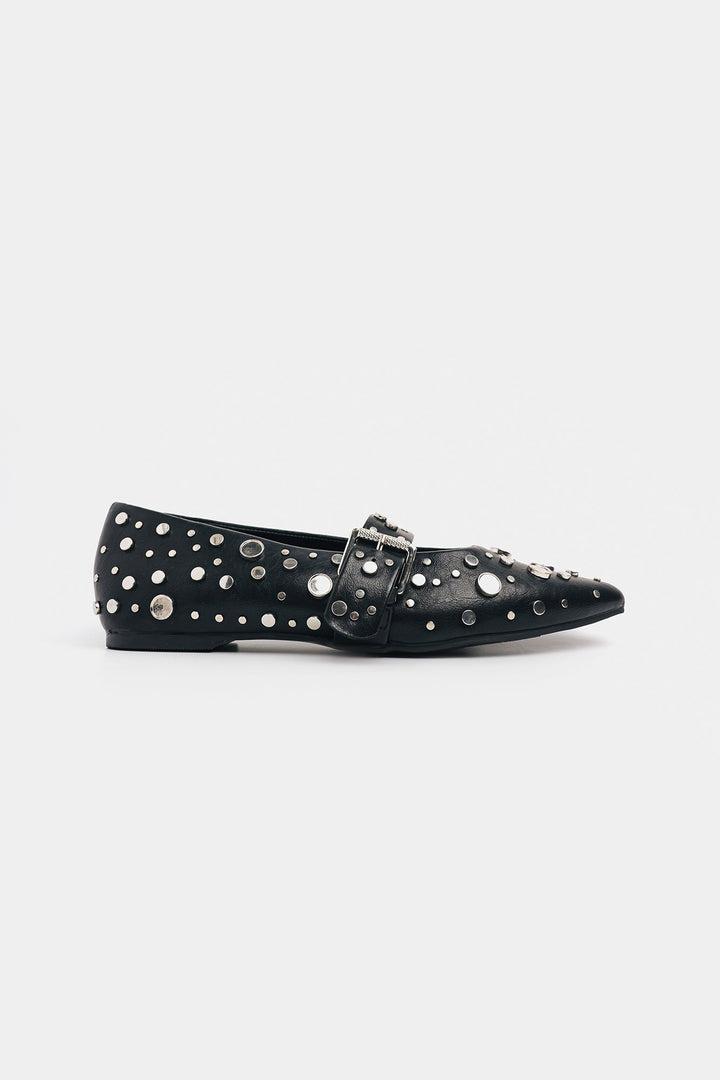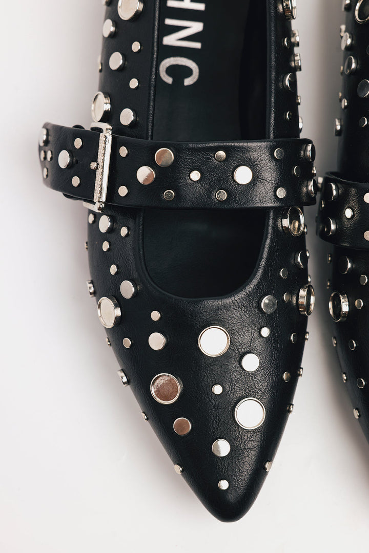 A contemporary women’s pump with a touch of glam with a strap across the upper, secured with a side buckle, and decorated with metallic circular studs of varying sizes all over, creating a modern, eye-catching look. Stylish yet comfortable, ideal for pairing with both eastern and western outfits for semi-formal or casual chic looks.