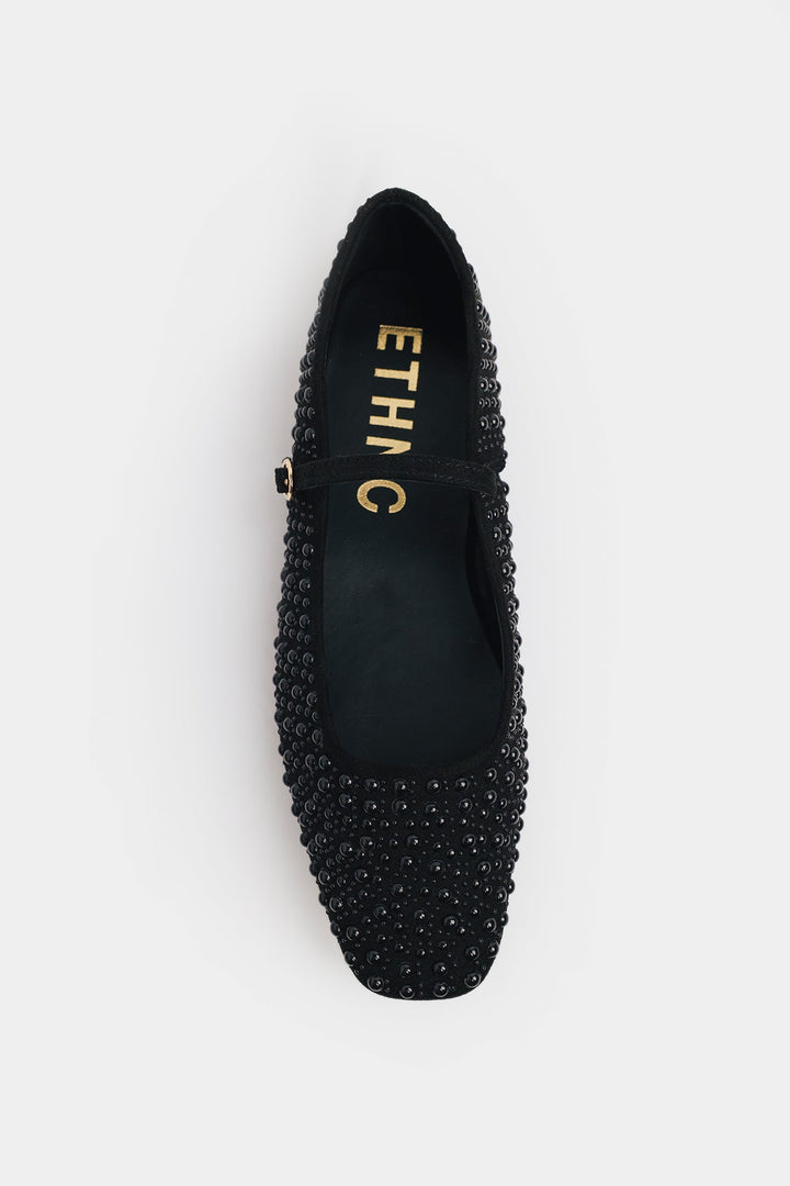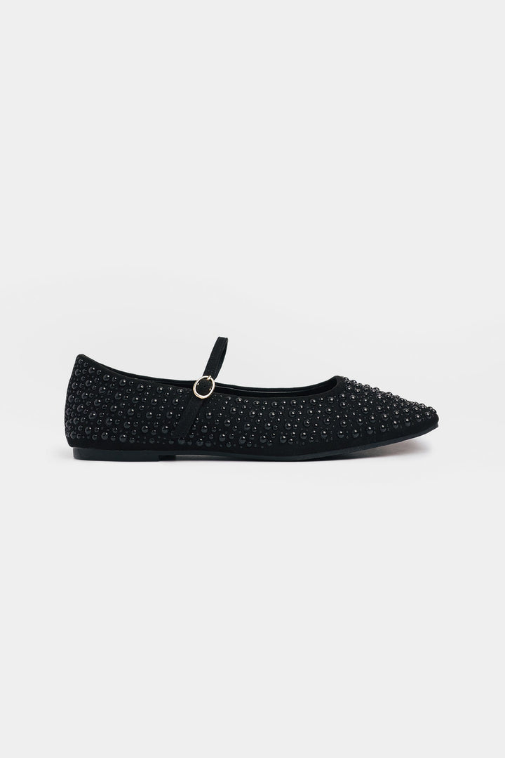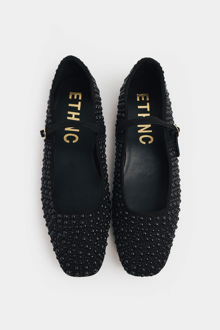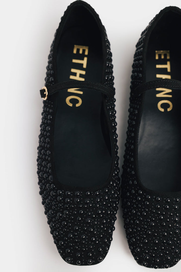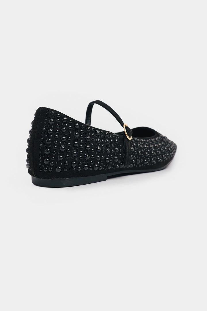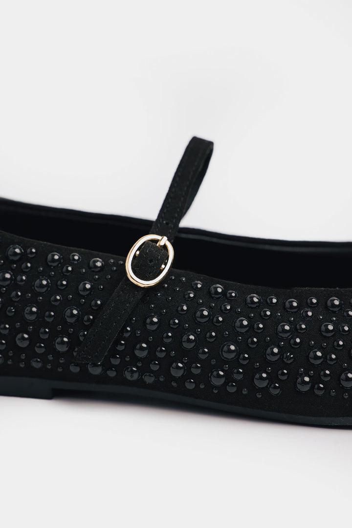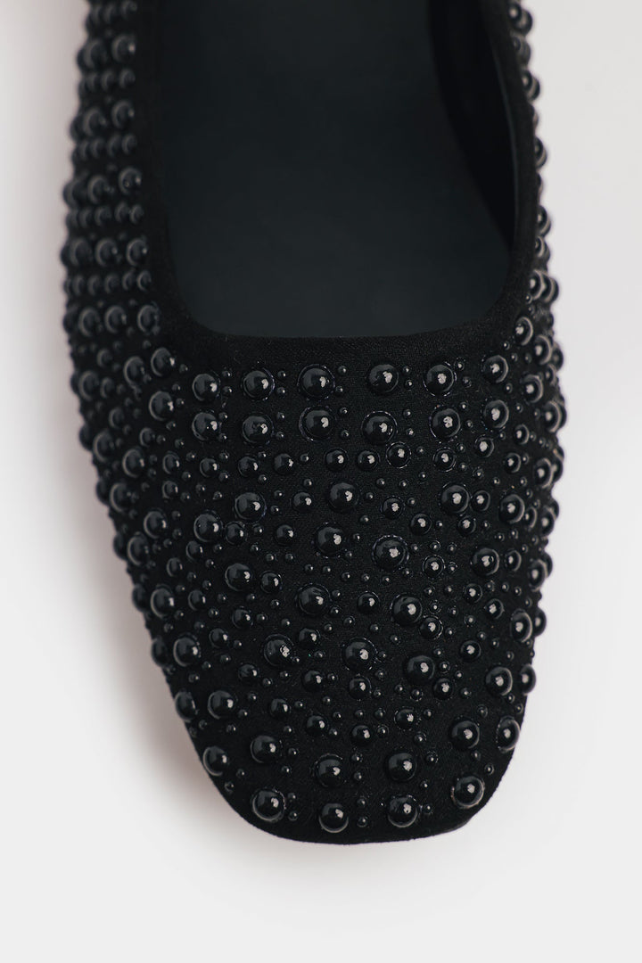 These black pumps feature a secure strap adorned with black beads, adding a sophisticated texture and subtle embellishment. Designed for both elegance and comfort, they offer a versatile option that complements formal and evening wear with refined style.