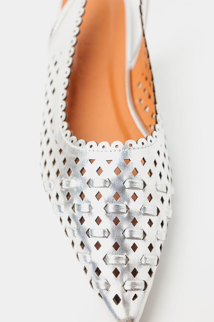 Step out in style with these eye-catching silver pumps! These pumps feature a beautiful laser-cut lattice pattern and scalloped edges, giving them a unique and elegant texture. A slingback strap ensures a secure and comfortable fit, while the pointed toe adds a touch of classic sophistication. Perfect for elevating any outfit, whether for a party or a special event.