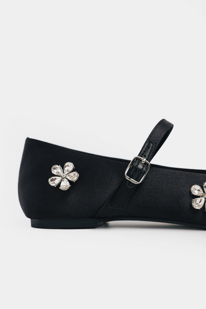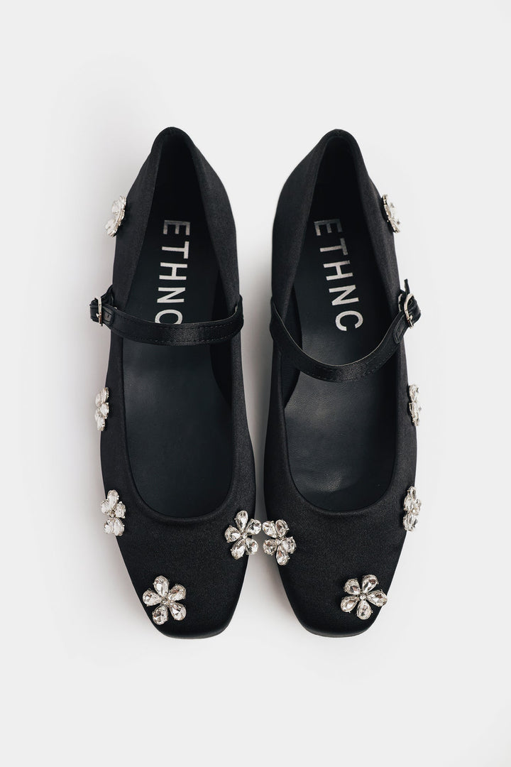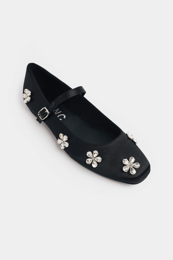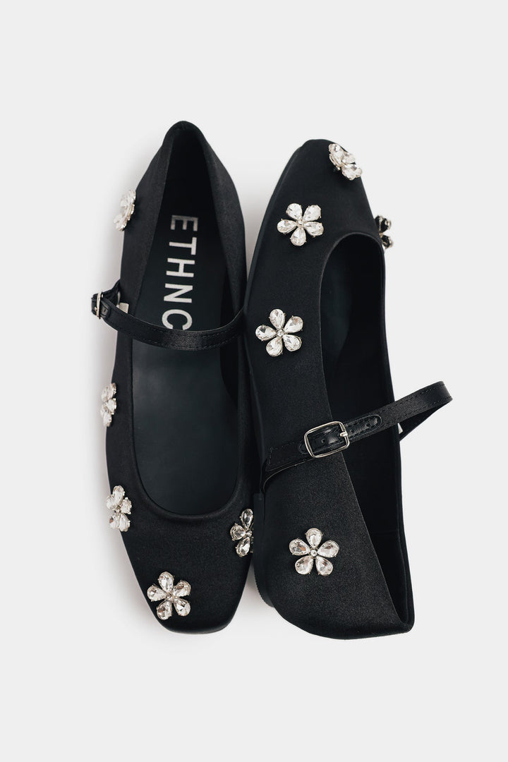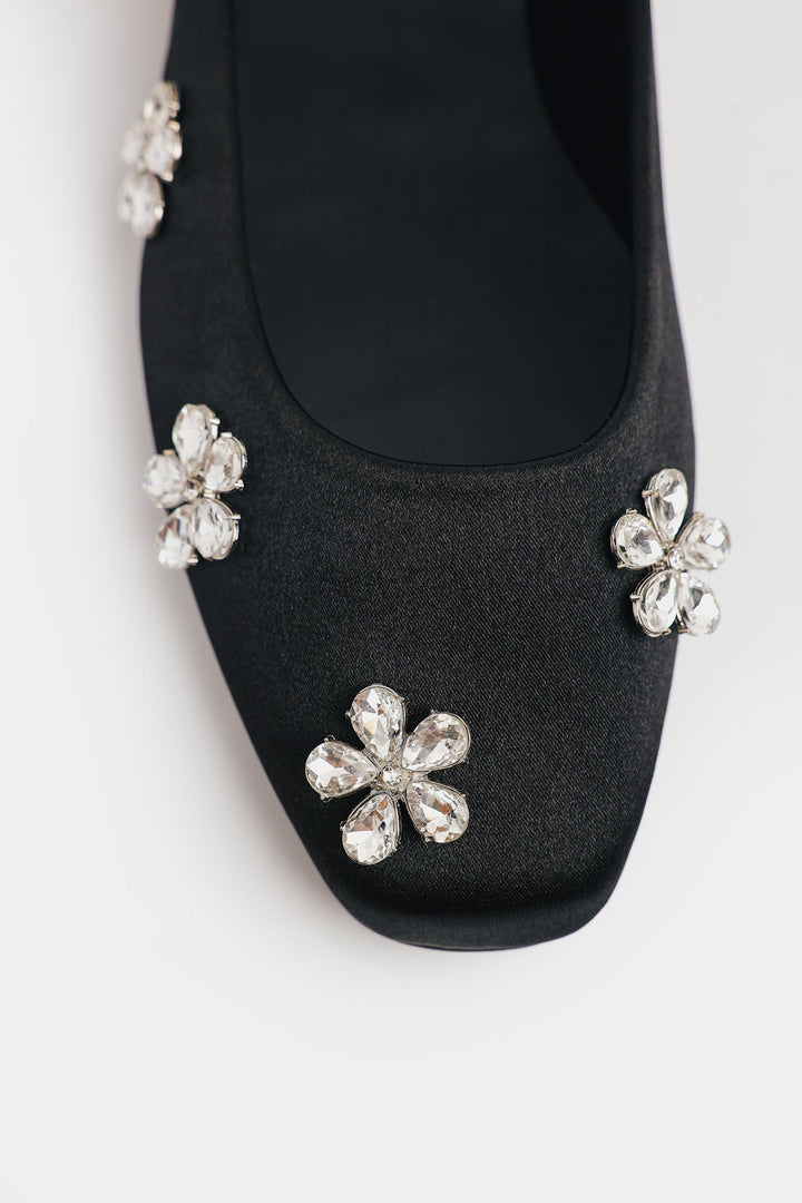 These black pumps are designed with a secure strap and adorned with flower-shaped studs throughout, offering a delicate yet striking decorative detail. The combination of classic color and unique embellishments provides a refined, expert-crafted look suitable for both formal occasions and stylish everyday wear.