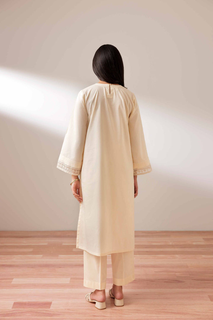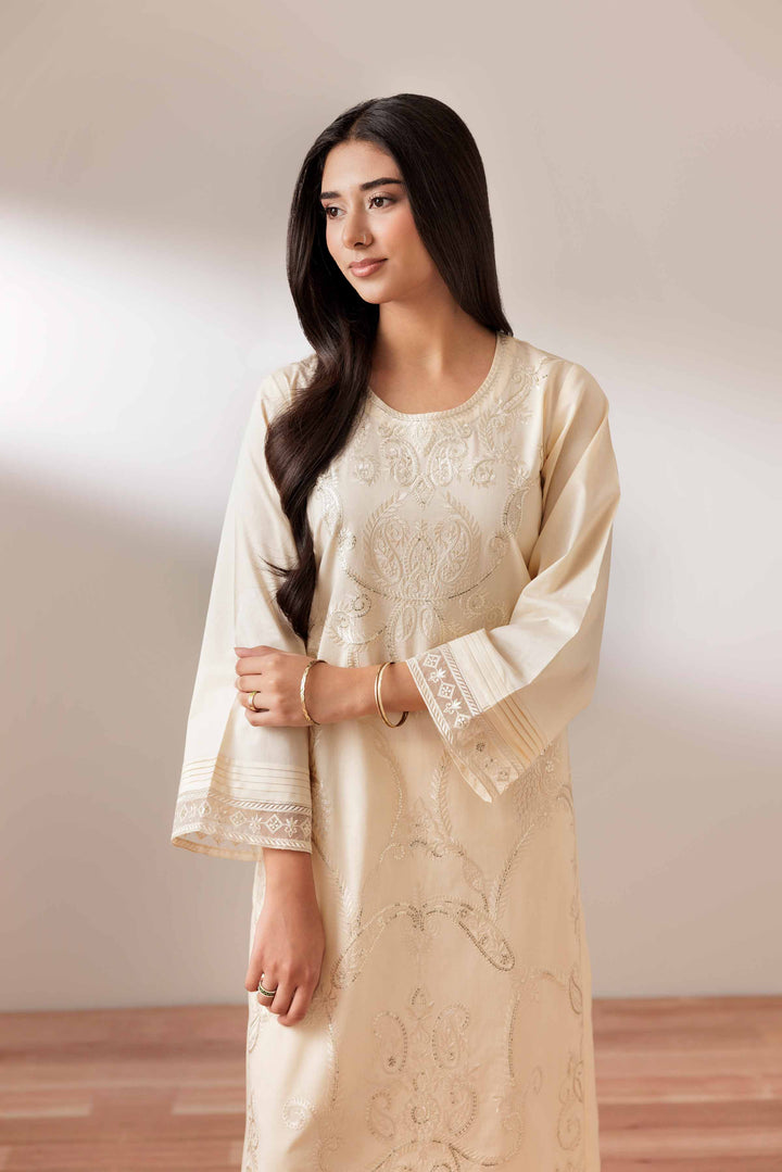 Straight shirt featuring embroidery on the central panel, styled with pleat details and topstitching on the hem and sleeves.