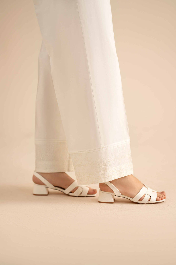 Loose straight trousers featuring embroidered border on hem and pleat details.