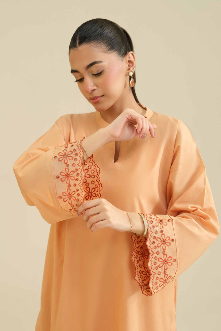 Shirt With Embroidery Boarder On Shirt Front And Sleeves.