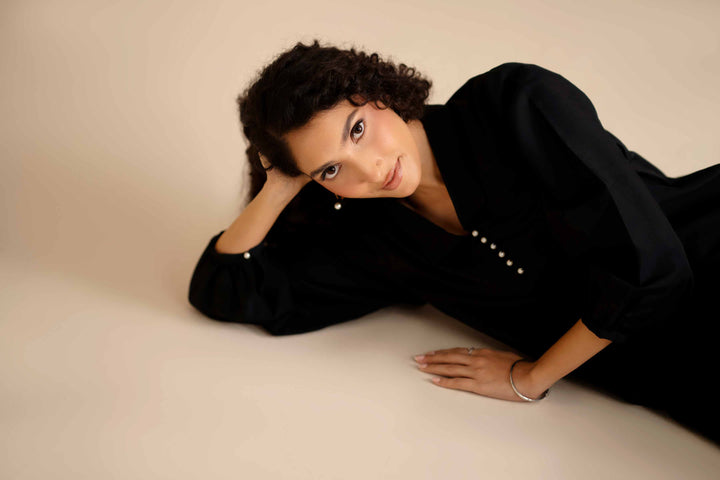 Statement straight long shirt with a pointed collar and slight gathers at the sleeves.