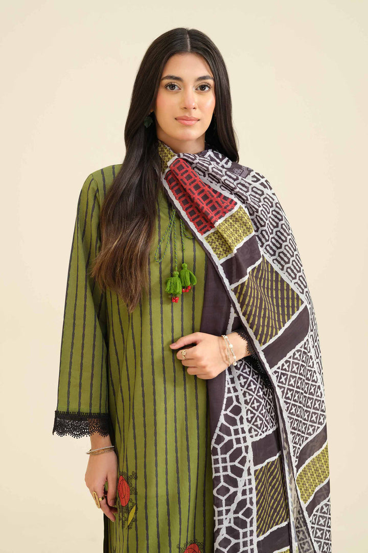 Refresh your winter wardrobe with this printed embroidered three-piece suit from the latest Pret Winter Collection, styled for effortless charm.