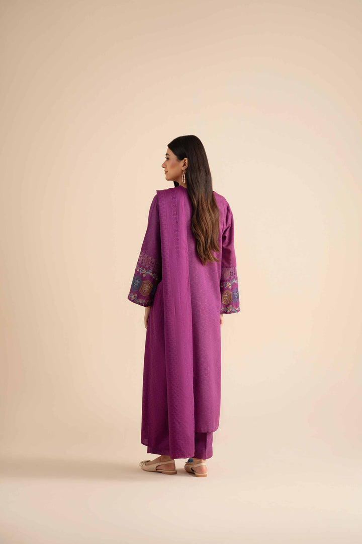 Elevate your winter look with this embroidered three-piece suit from the latest Pret Winter Collection, designed for graceful sophistication.