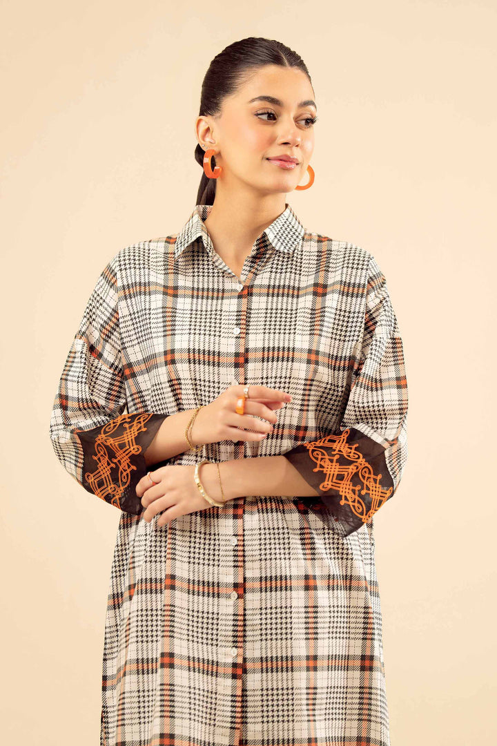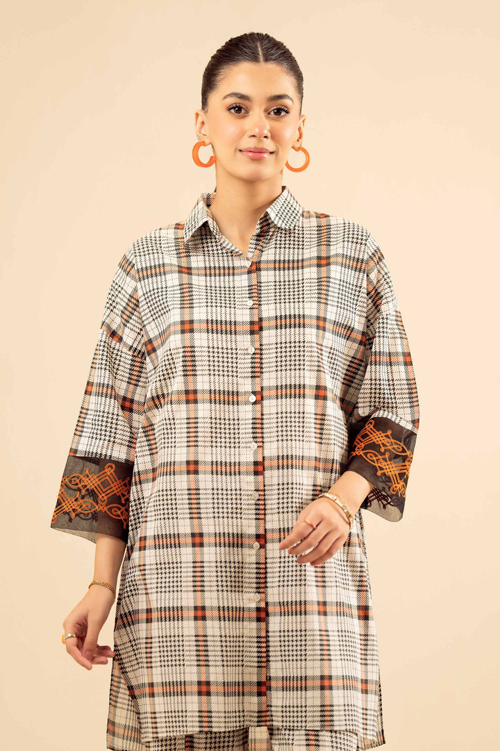 Button-down short tunic with extended embroidered organza on the sleeves.