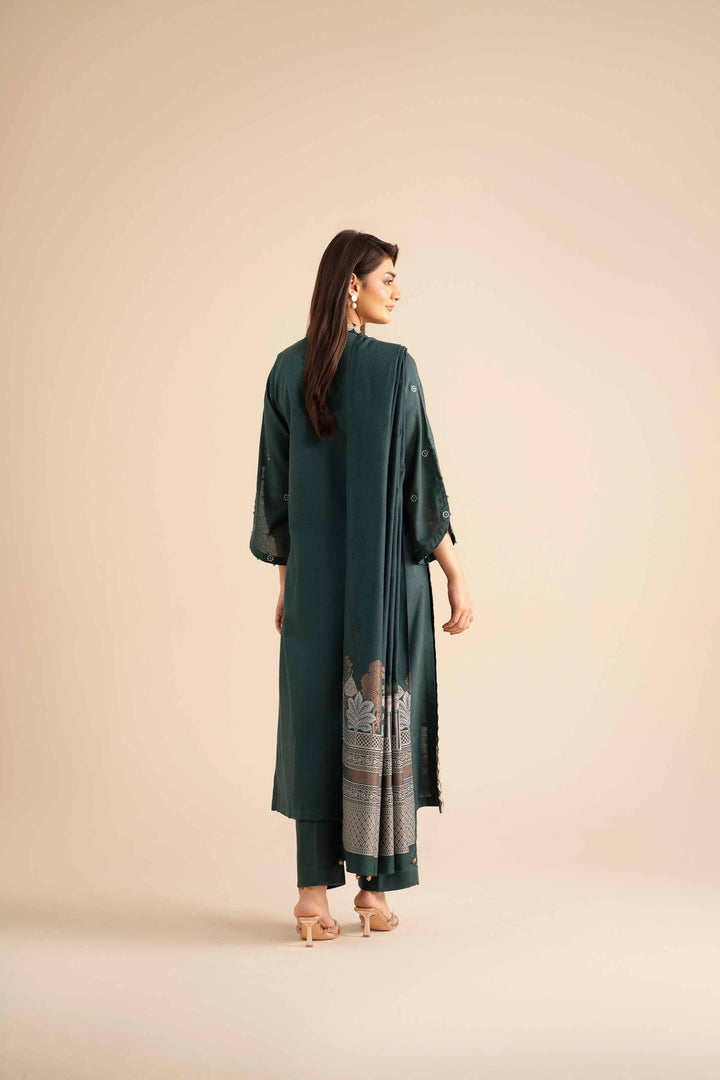 Upgrade your wardrobe with this embroidered three-piece suit from the latest Pret Winter Collection, styled for timeless elegance.