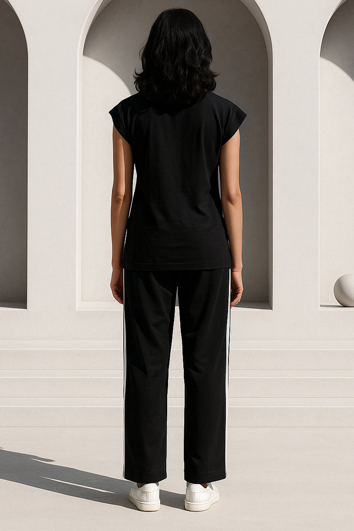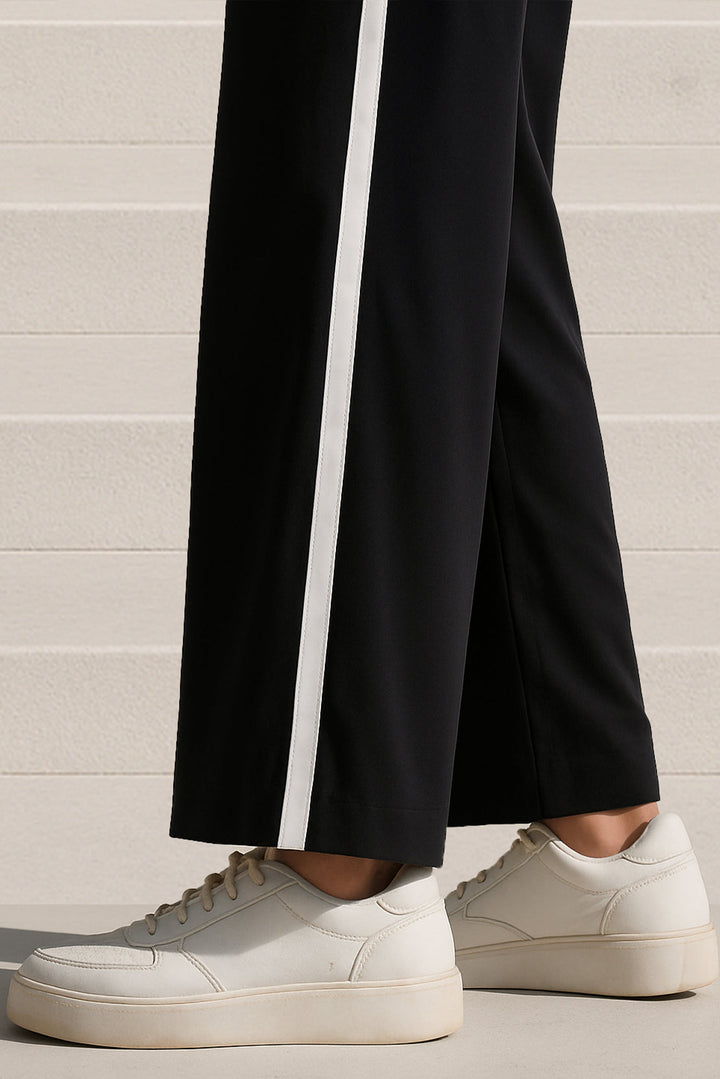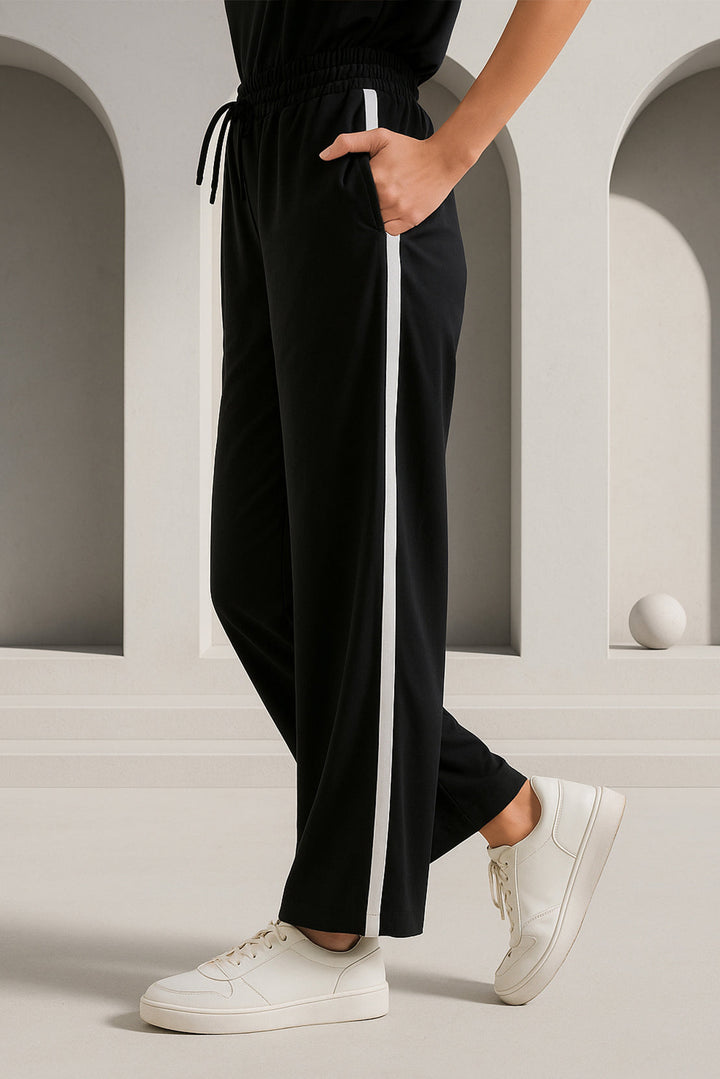 Refine Your Everyday Wardrobe With SAYA’s Relaxed Drawstring Trousers In Black With White Stripe, Expertly Crafted From Premium Scuba Fabric Offering A Smooth Texture, Structured Drape, And Gentle Stretch. The Relaxed Silhouette Ensures Effortless Movement, While The Adjustable Drawstring Waist Provides A Secure, Personalized Fit. Accentuated With A Contrasting White Side Stripe, These Trousers Bring A Sporty Yet Sophisticated Edge To Classic Black. Perfect For Casual Outings, Travel, Or Elevated Loungewear, They Blend Contemporary Design With Supreme Comfort And Versatility.