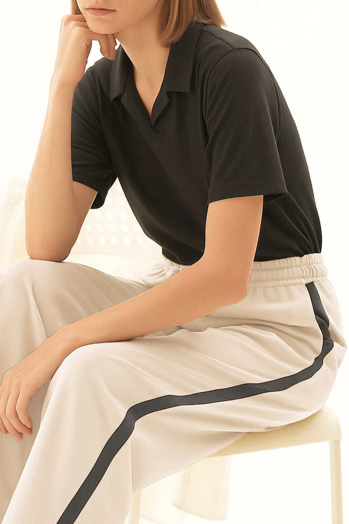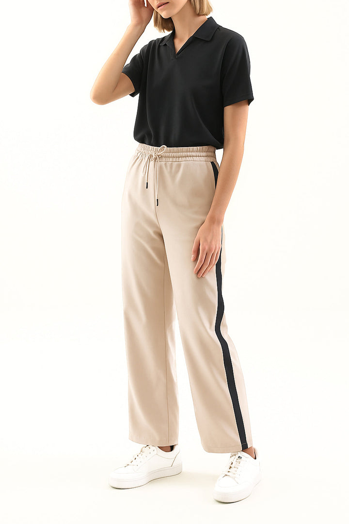 Embrace Modern Ease With SAYA’s Relaxed Drawstring Trousers In Beige With Black Stripe, Tailored From Premium Scuba Fabric Known For Its Smooth Texture, Structured Drape, And Gentle Stretch. The Relaxed Silhouette Offers Exceptional Comfort, While The Adjustable Drawstring Waist Ensures A Perfect, Personalized Fit. A Contrasting Black Stripe Along The Sides Adds A Sleek, Contemporary Touch To The Soft, Neutral Base, Creating A Chic Balance Between Casual And Refined. Ideal For Travel, Lounge, Or Everyday Wear, These Trousers Combine Functionality, Comfort, And Timeless Style Effortlessly.