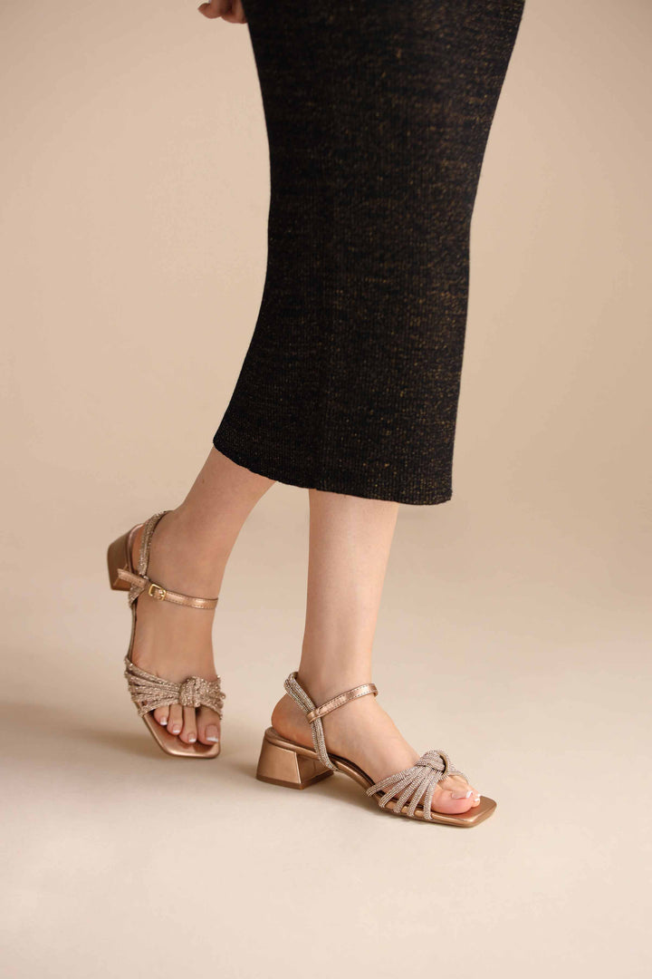Elevate your evening look with these chic square-toe block heels, featuring a knotted embellished upper, adjustable ankle strap, and padded insole for comfort. Finished with a durable rubber outsole for grip and lasting wear.