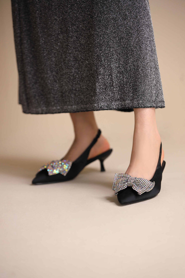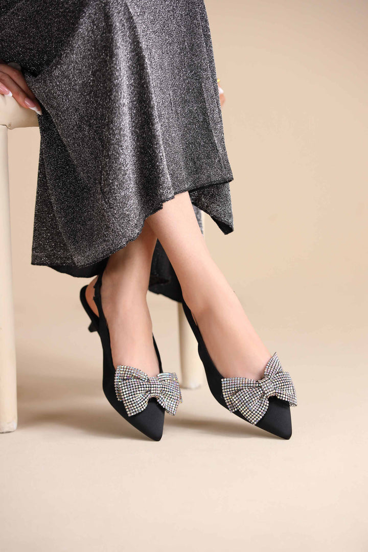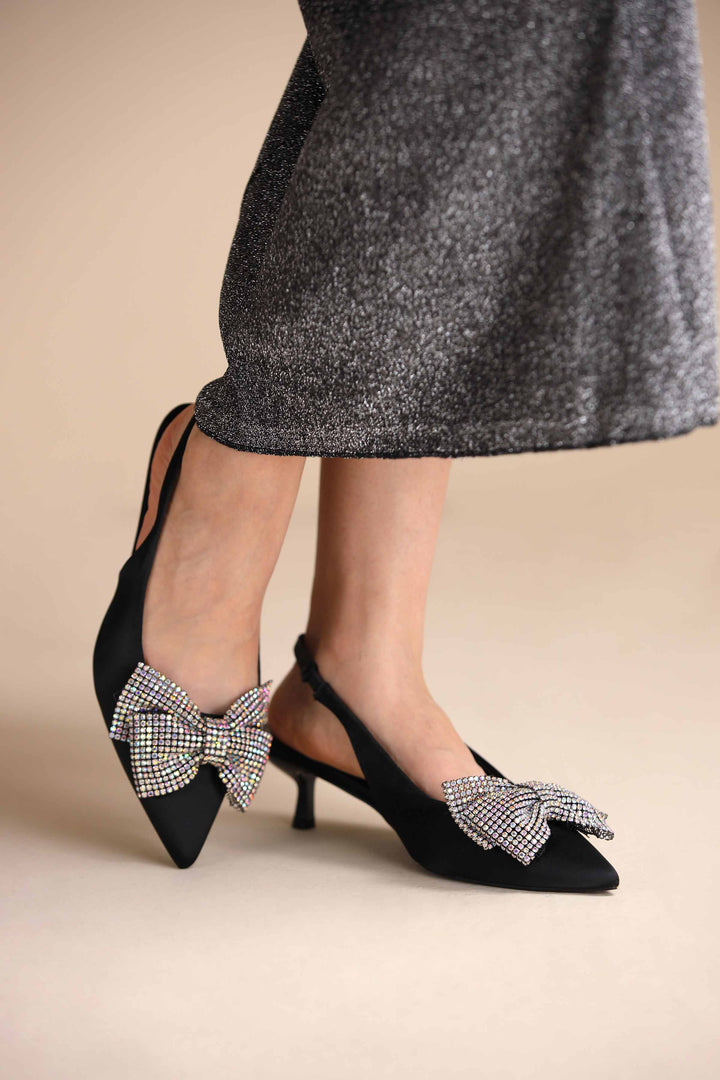 Add a touch of glamour with these black pumps, featuring a pointed toe, dazzling rhinestone bow, and a sleek silhouette perfect for evening elegance and special occasions.