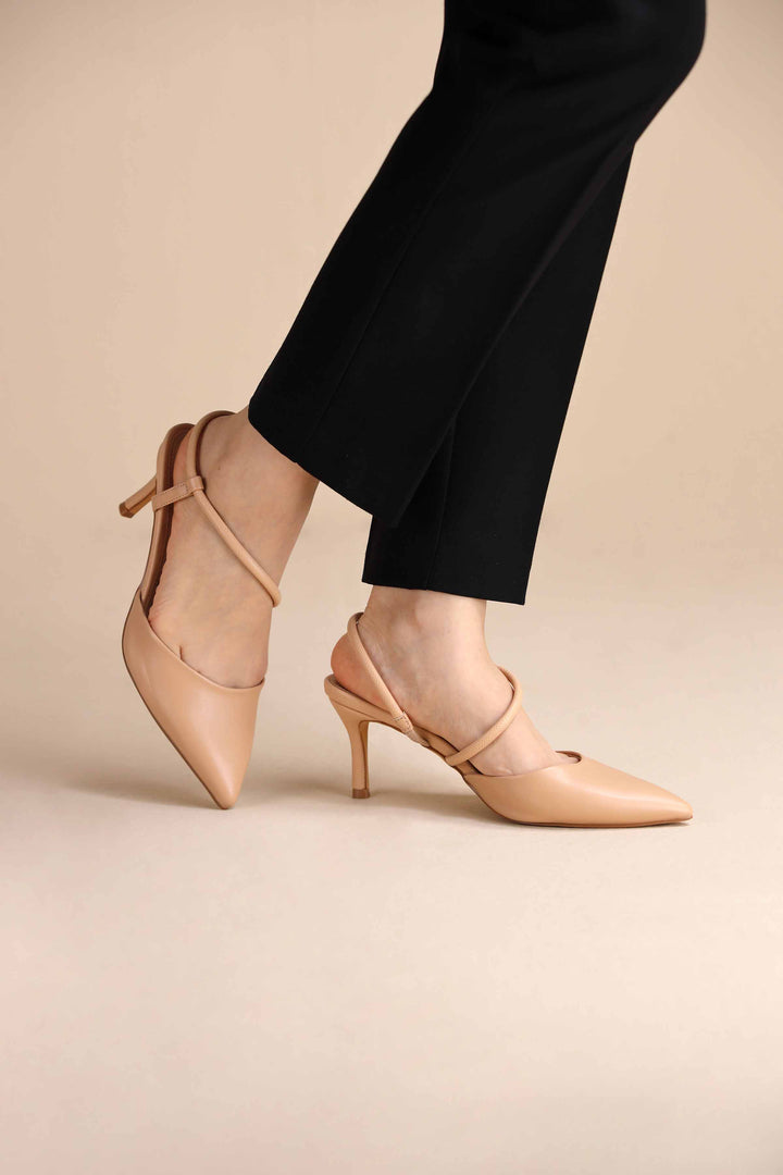 Chic beige pointed-toe heels with sleek straps, blending elegance and versatility. A timeless style to complement both casual and formal looks.