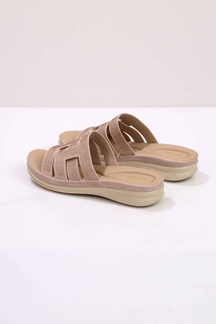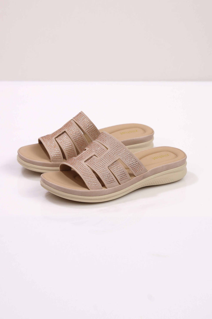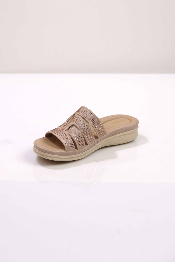Stylish beige wedge slippers adorned with delicate rhinestone accents, offering a blend of elegance and all-day comfort.