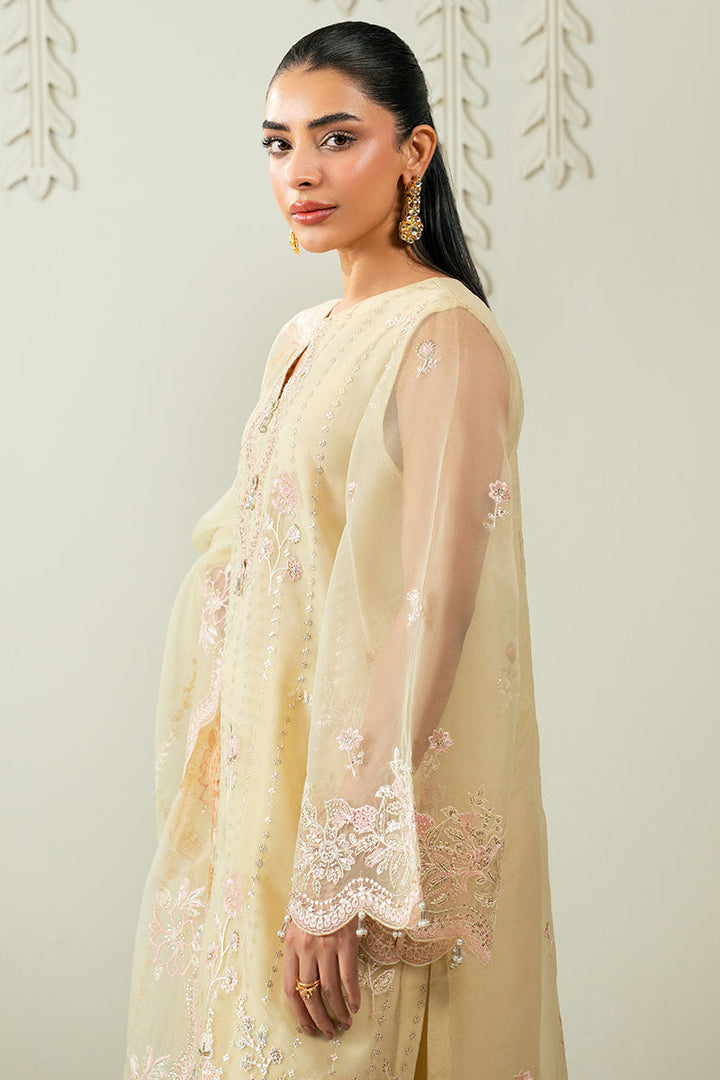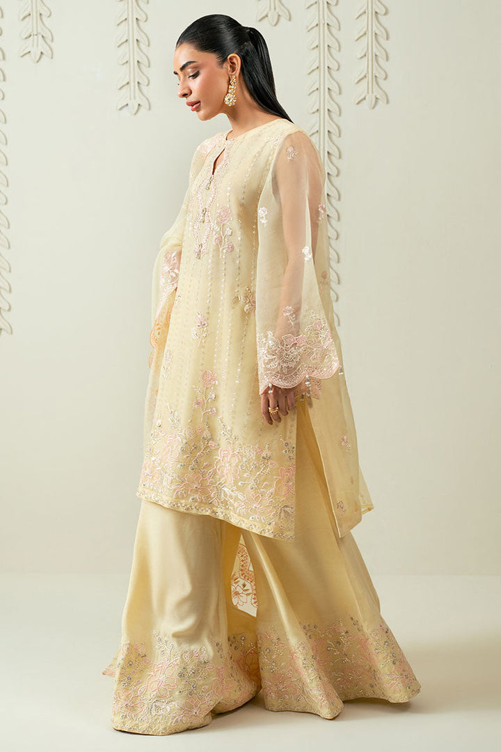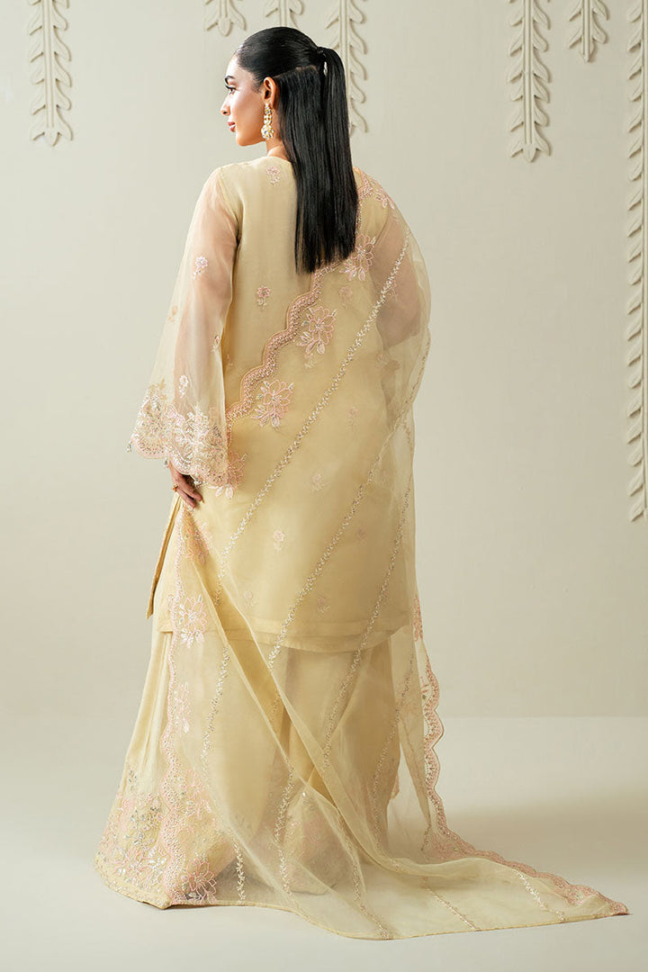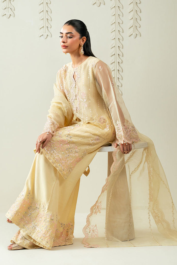 This elegant 3-piece ensemble features a short organza shirt with intricate front and back embroidery, complemented by an embroidered neckline and delicate tasseling. The flared sleeves add a graceful touch, enhanced by matching tassels. The silk plazzo trousers are beautifully dyed and embroidered, offering both comfort and style. Completing the set, the organza dupatta is richly dyed and adorned with embroidery, perfect for a refined, cohesive look. Ideal for sophisticated occasions, this set combines luxurious fabrics with expert craftsmanship.