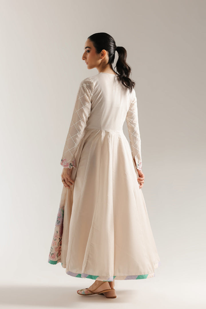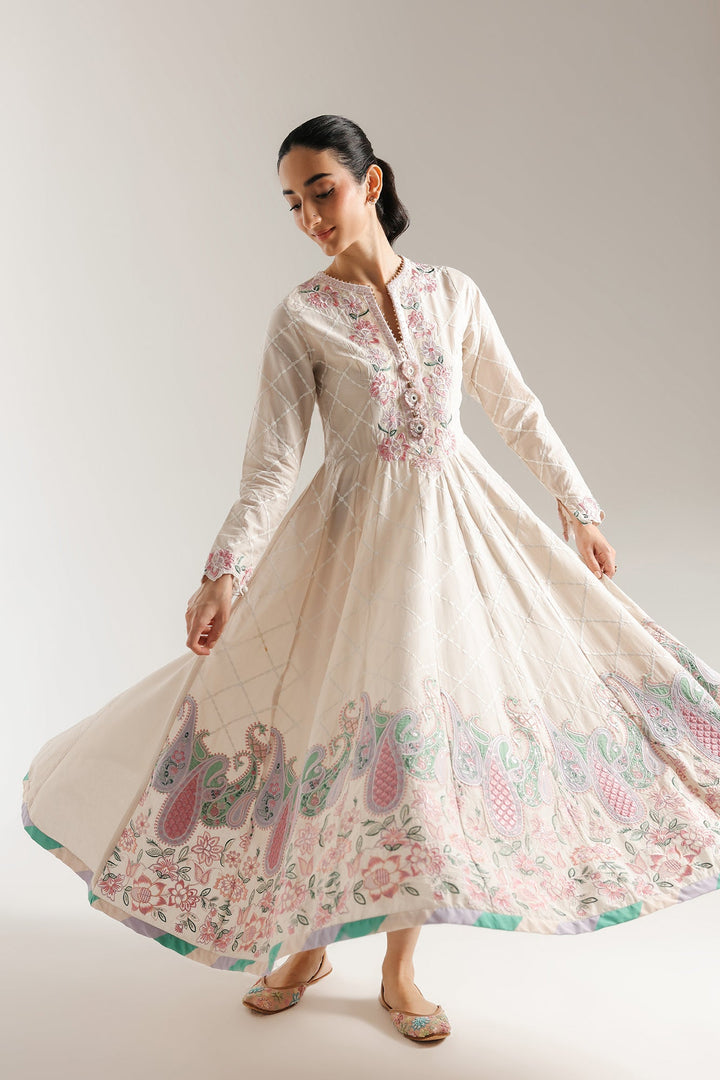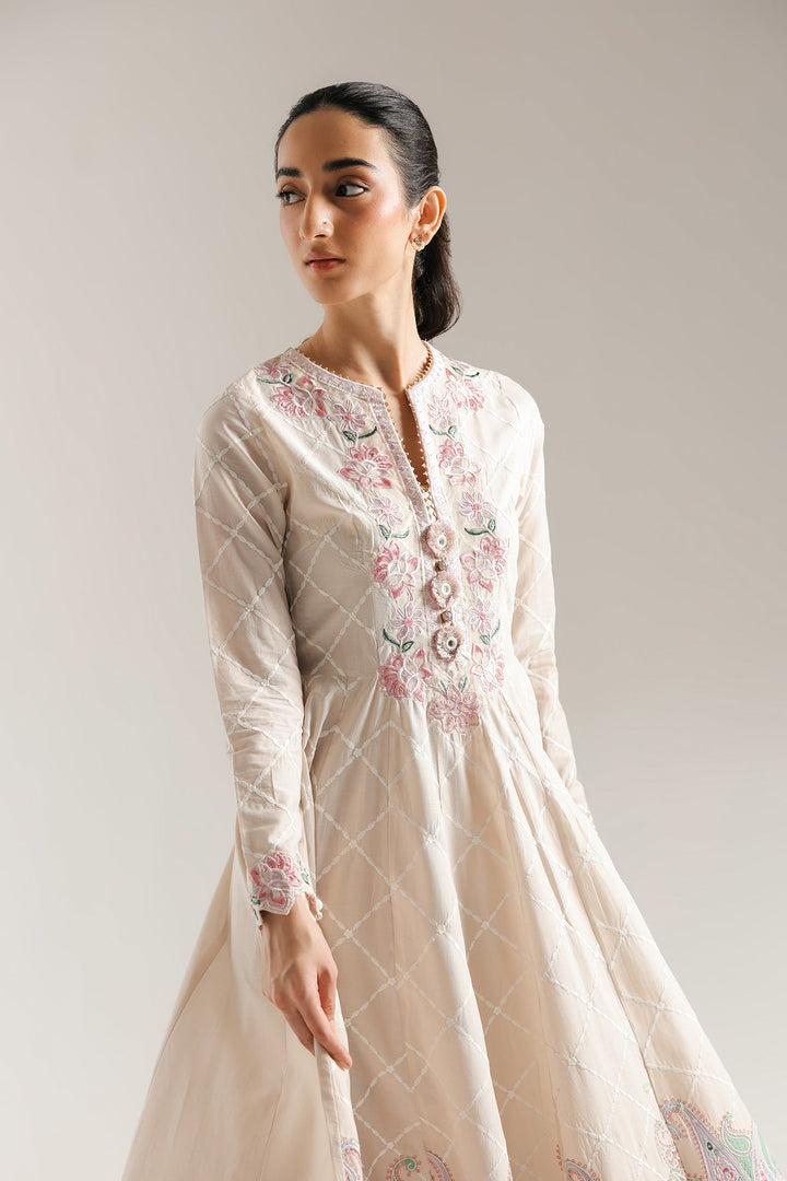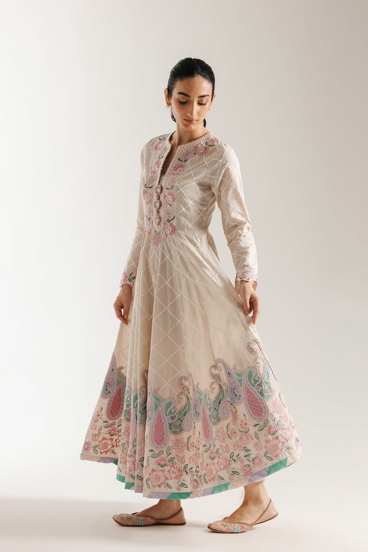 Make a graceful statement in this stunning embroidered dress. This long, flowing dress features a beautiful blend of traditional and modern design. The bodice is a soft, off-white fabric with a subtle checkered pattern, adorned with intricate floral and vine embroidery in delicate shades of pink and green. The dress has a classic A-line silhouette, with a voluminous skirt that flows beautifully. The hem is decorated with a vibrant, paisley-inspired border in a colorful palette of purple, green, and pink. This dress is perfect for any special occasion.