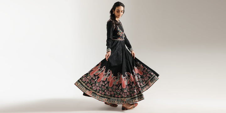This exquisite black dress is a masterpiece of design, blending traditional elegance with modern sophistication. The outfit features a flowing, full-length dress in a solid black fabric with a subtle checkered pattern. It is beautifully styled with a short, embroidered waistcoat that sits over the bodice. The waistcoat is a vibrant burst of color, adorned with intricate floral embroidery in shades of red, pink, and green. The dress is further elevated by a spectacular, wide border at the hemline, showcasing a detailed, colorful paisley and floral pattern. This ensemble is a perfect choice for a grand celebration, offering a timeless and captivating look.