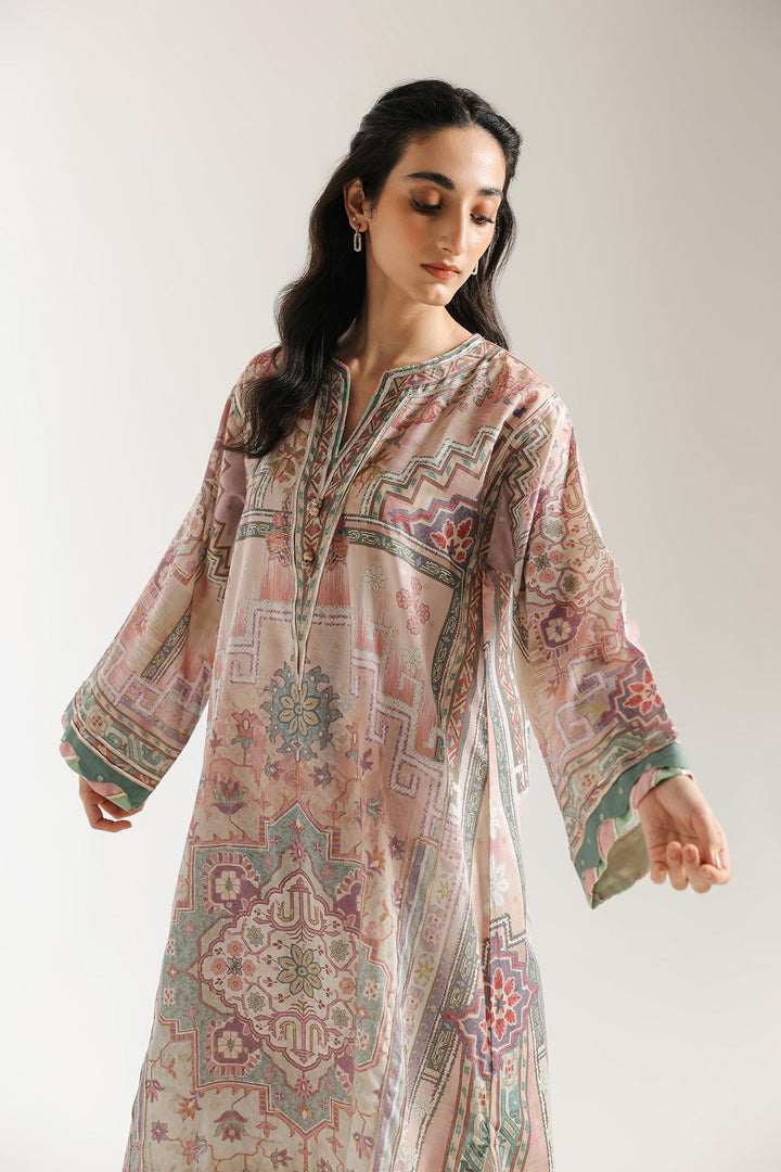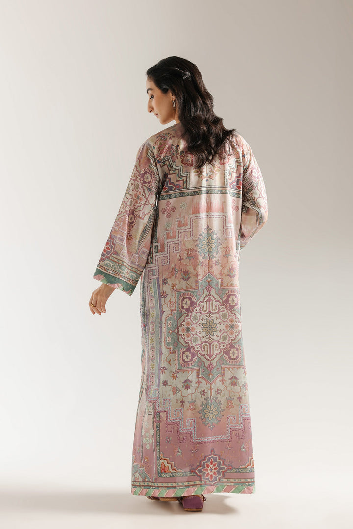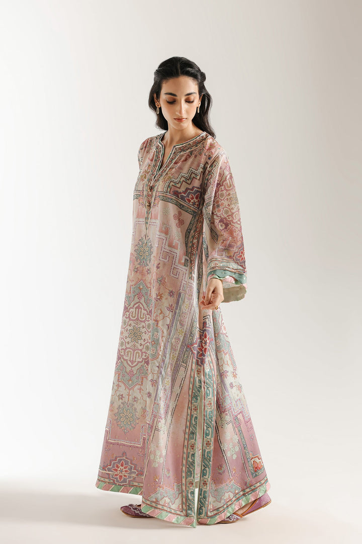 This exquisite, embroidered dress features a beautiful, flowing silhouette and a sophisticated design. The fabric has a delicate sheen and is adorned with an intricate, ornate pattern that incorporates elements of traditional motifs in a soft, elegant color palette of blush pink, muted green, and lilac. The dress has a relaxed, graceful drape, with full-length sleeves that are finished with a broad, contrasting border. The neckline is embellished with detailed gotta work, adding a touch of sparkle. This piece is a perfect choice for a special occasion, offering a timeless and luxurious feel.