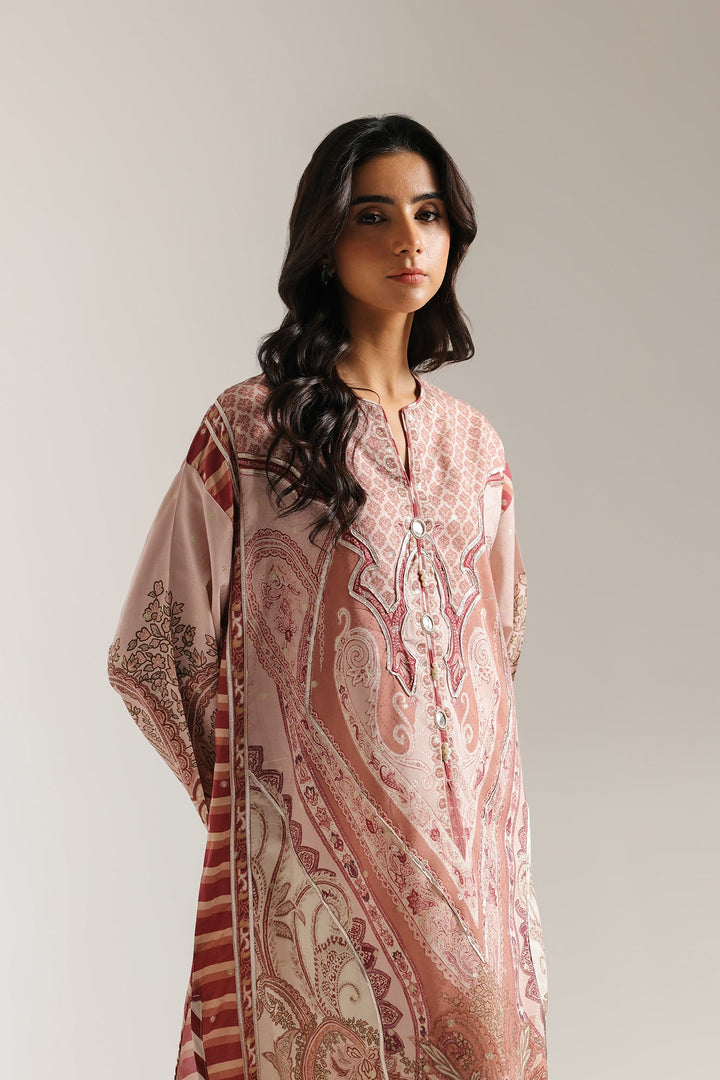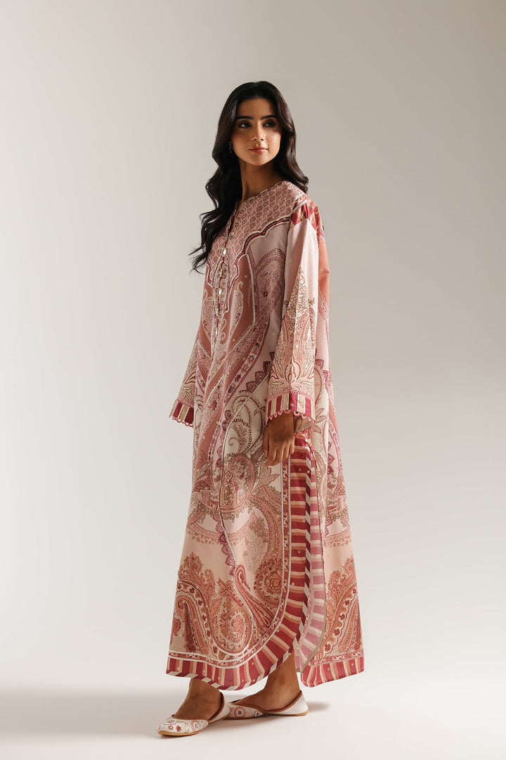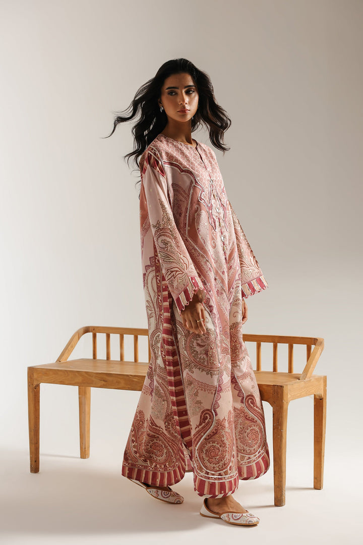 Step out in style with this stunning jacquard dress. This long, flowing dress is a masterpiece of intricate design. The soft pink base is a graceful canvas for the elaborate paisley and floral patterns, with subtle zari work, adding a touch of sparkle and opulence. The dress has a classic A-line silhouette, perfect for making a sophisticated statement at any event.