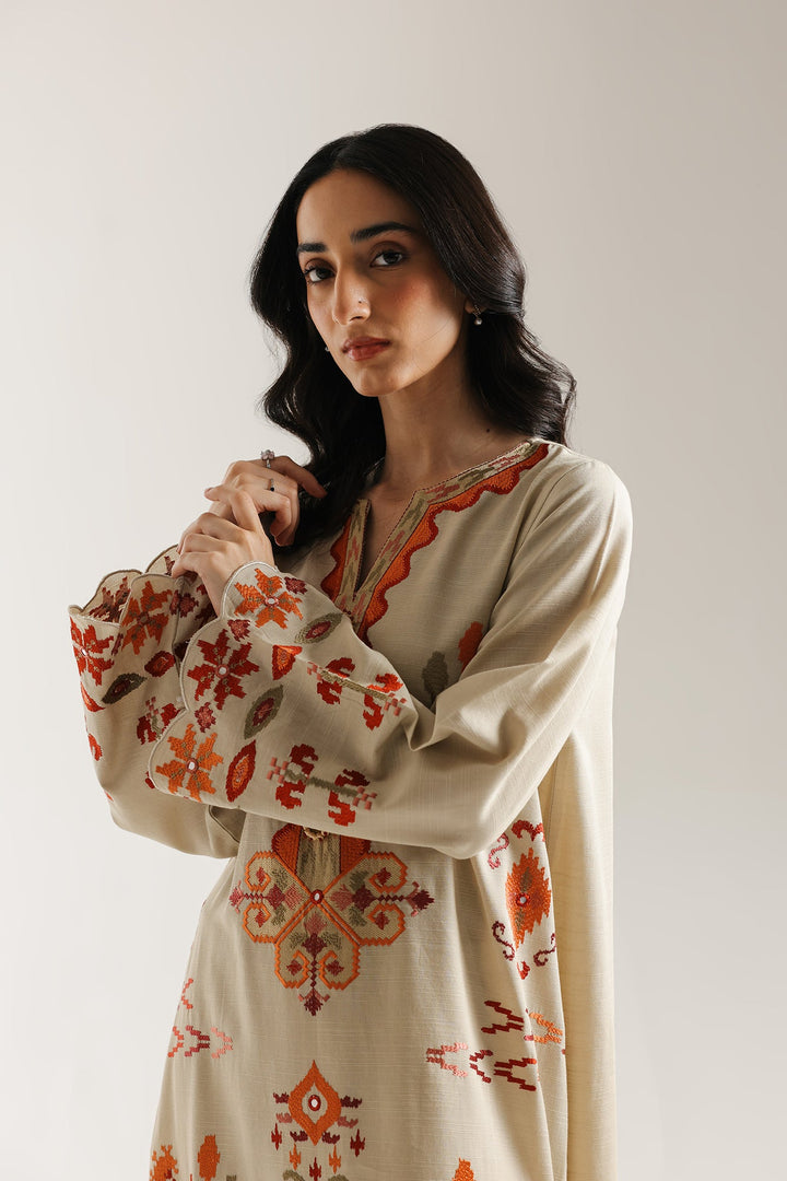 Envelop yourself in the rich, earthy tones of this magnificent embroidered kaftan. Crafted from a creamy beige fabric, the long, flowing dress is a canvas for striking tribal and geometric embroidery in warm shades of rust, orange, and deep brown. The intricate patterns, which cover the entire front, neckline, and cuffs, create a captivating look. The kaftan features a deep V-neckline framed by a stylized embroidered border, making this a unique and sophisticated statement piece.