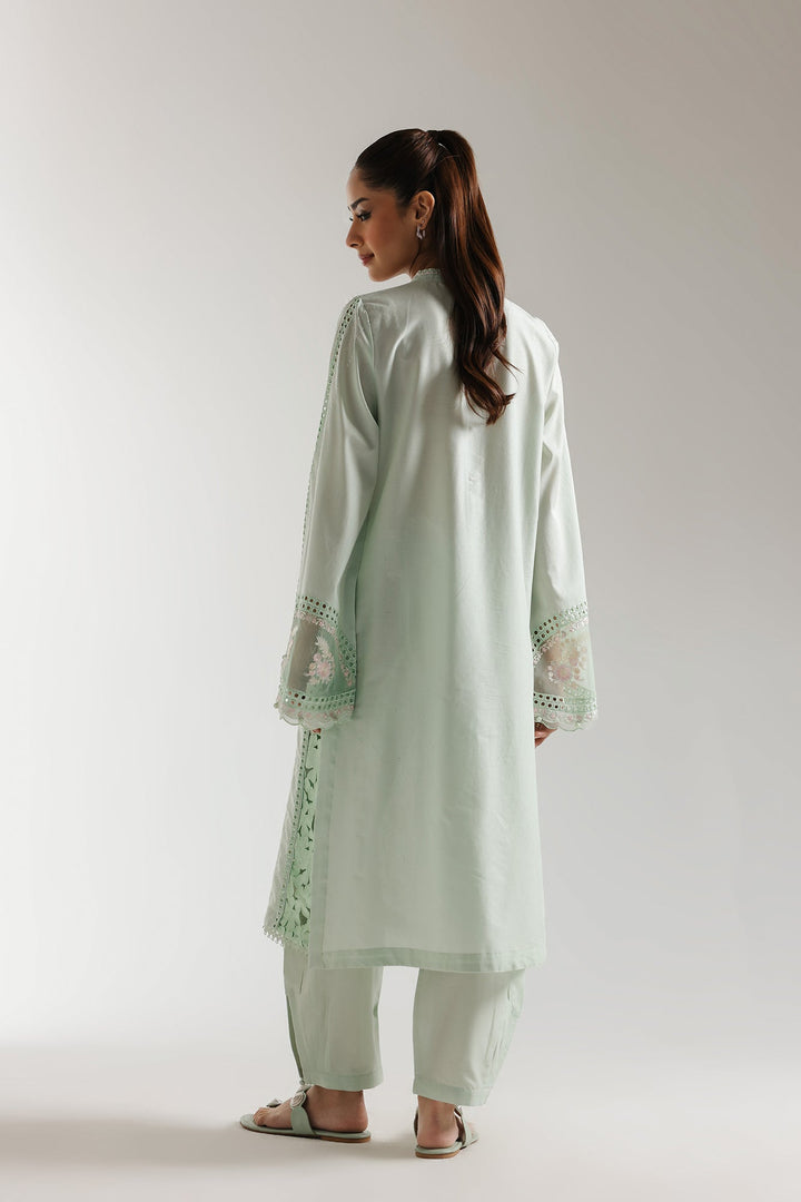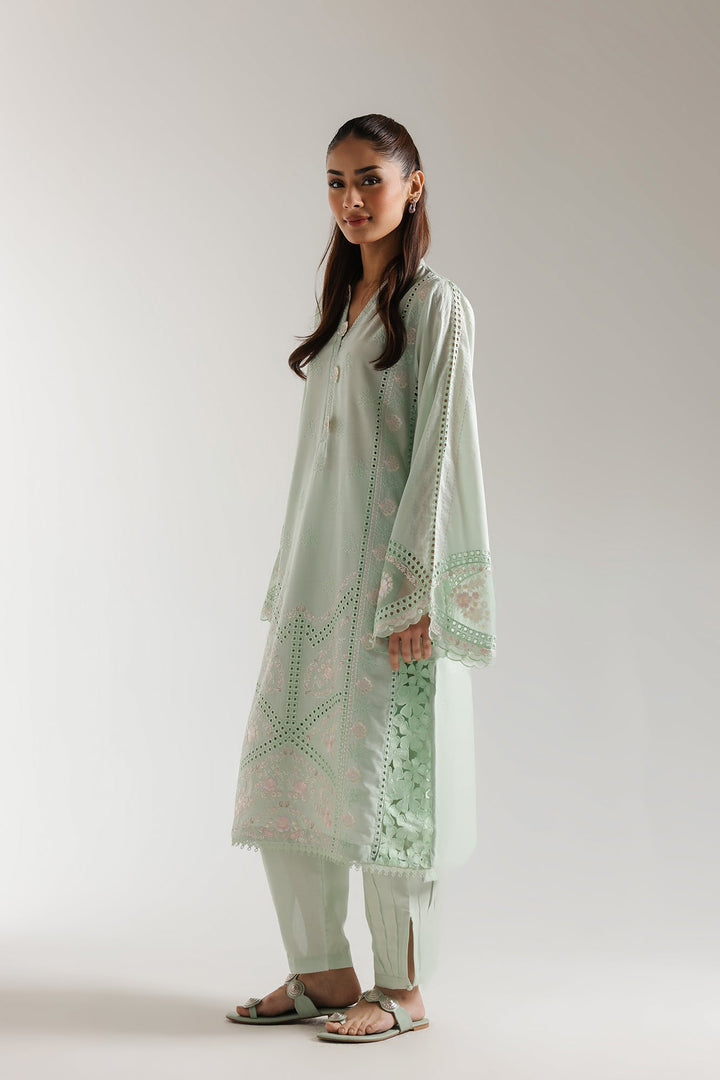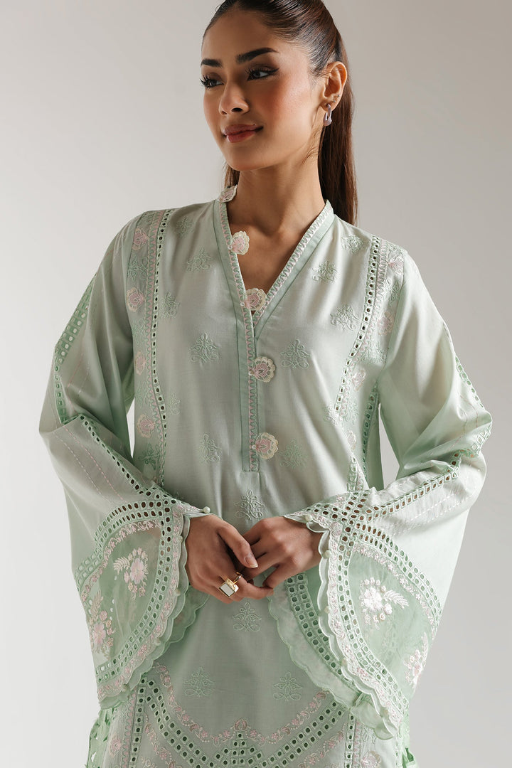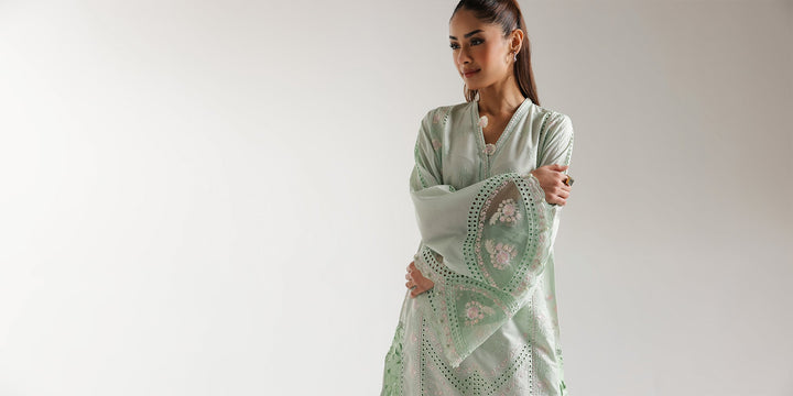 A classically chic composition is portrayed on this style statement outfit. It features a contemporary pale green shirt beautifully adorned with captivating floral designs embroidered with intricate technique and enhanced with schiffli details. Paired with a trendy loose fit baggy silhouette trouser with button closure at bottom opening. This gorgeous outfit is a great addition to your summer season wardrobe.